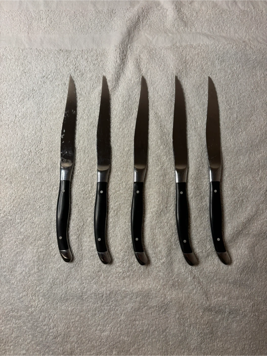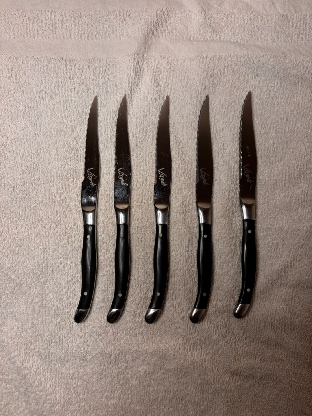 $60 or best offer - High-quality Virgule steak knives featuring thick, full-tang stainless steel blades and elegant black handles with metal end caps. These are not lightweight, the steel runs solid through the handle, giving them excellent balance, strength, and durability.