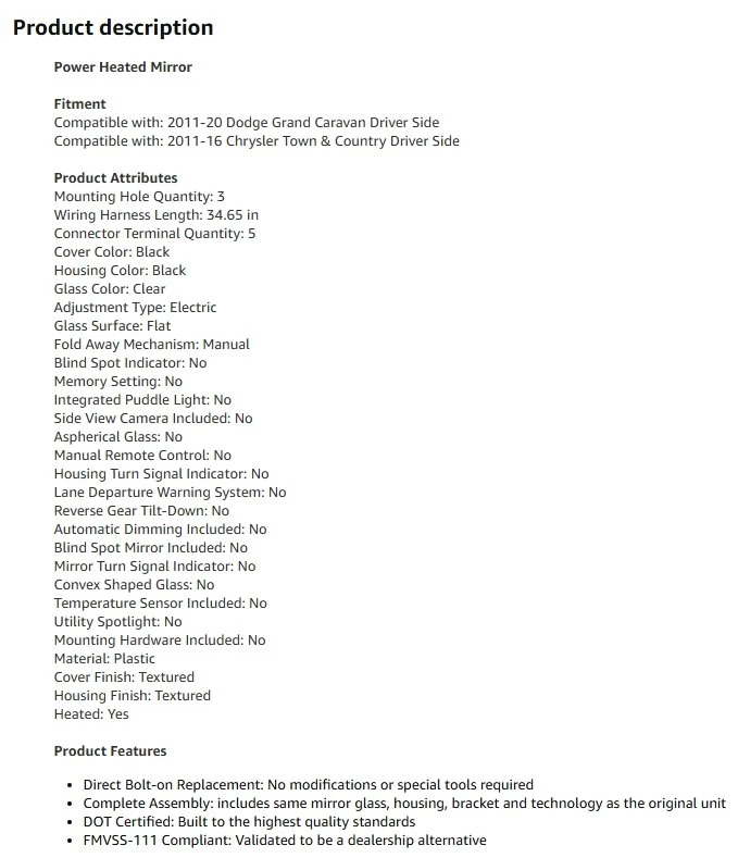 I'm selling a new TRQ driver's side power heated manual folding mirror, textured in black, compatible with 2011-2016 Chrysler Town & Country and 2011-2020 Dodge Grand Caravan. This mirror has never been installed and is ready to provide enhanced visibility and safety for your vehicle.