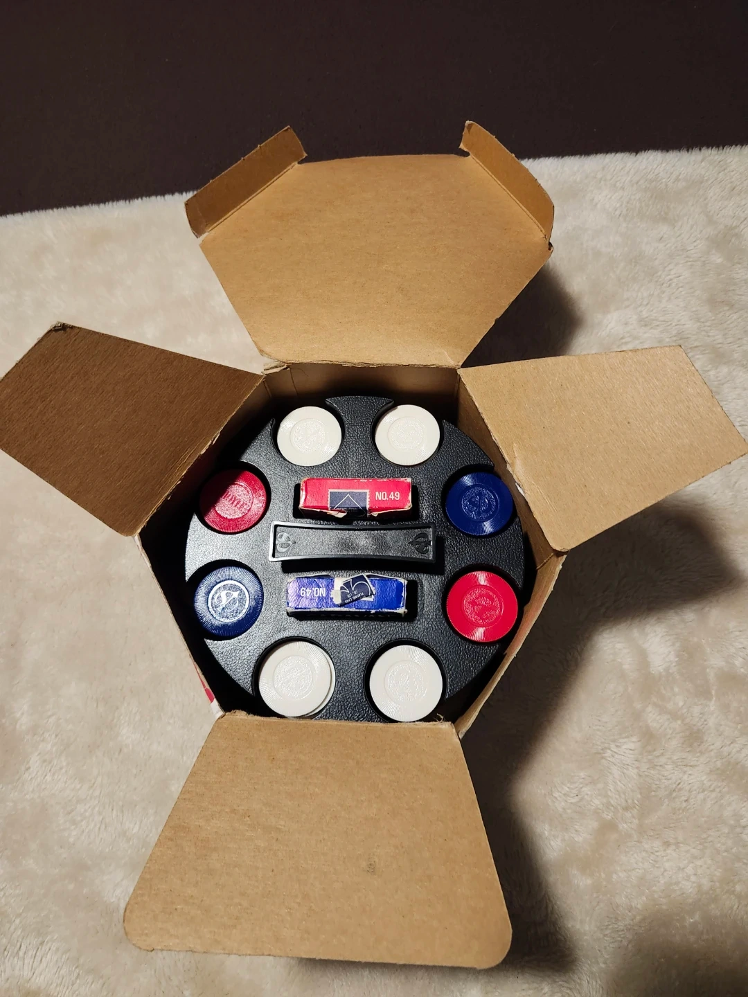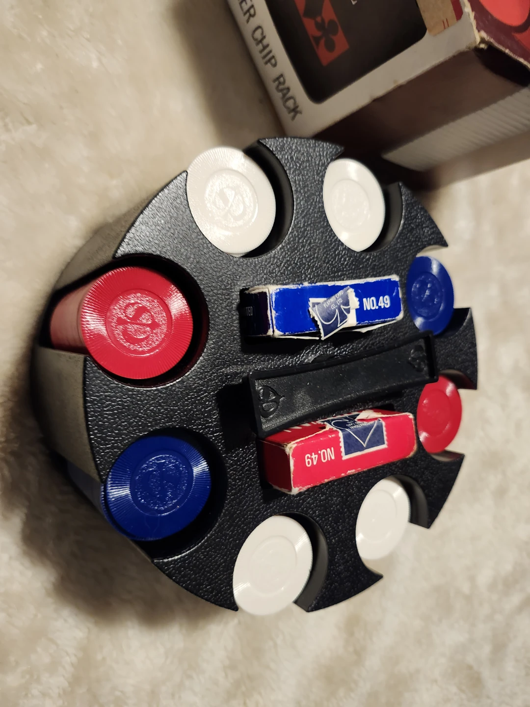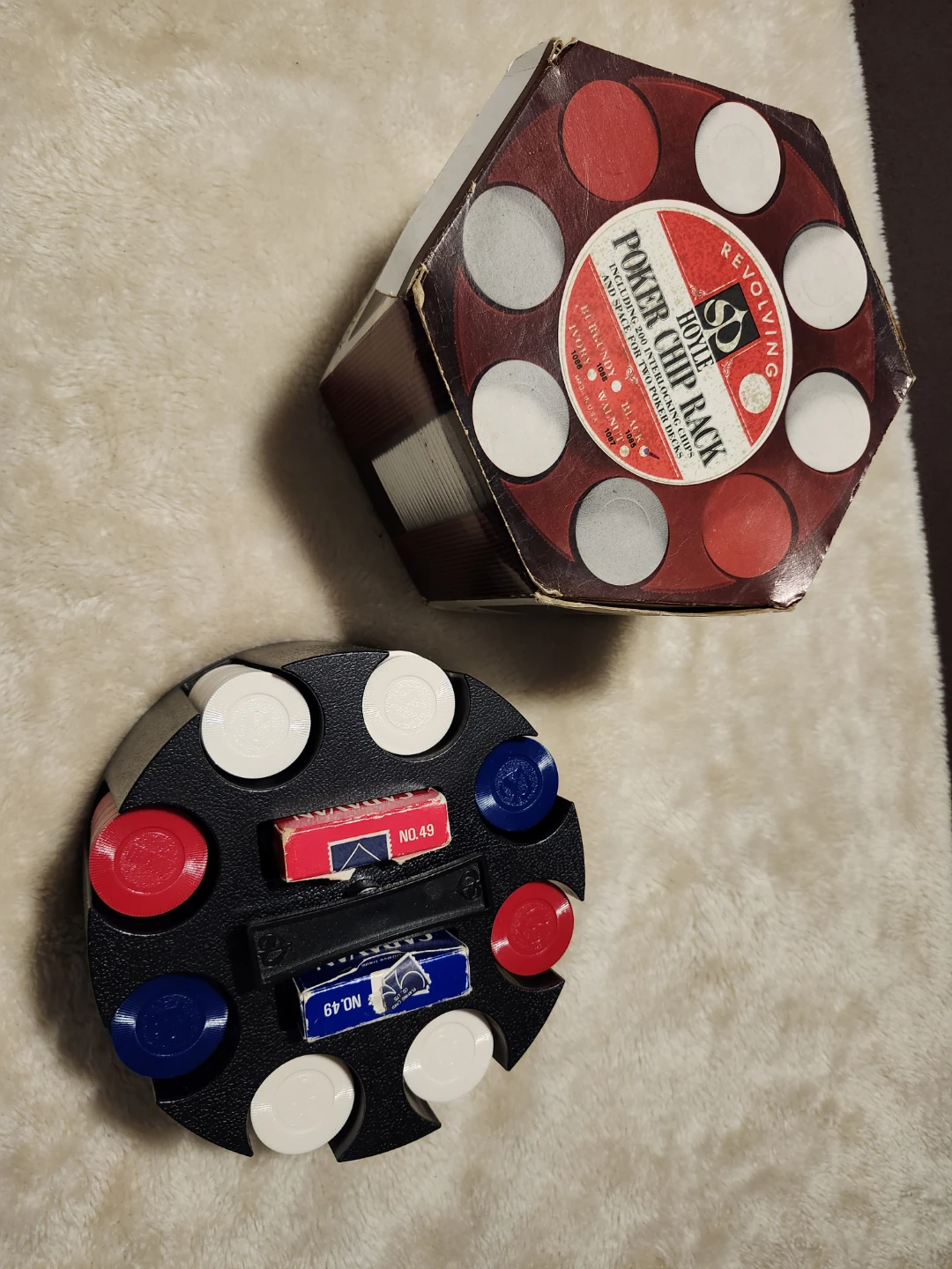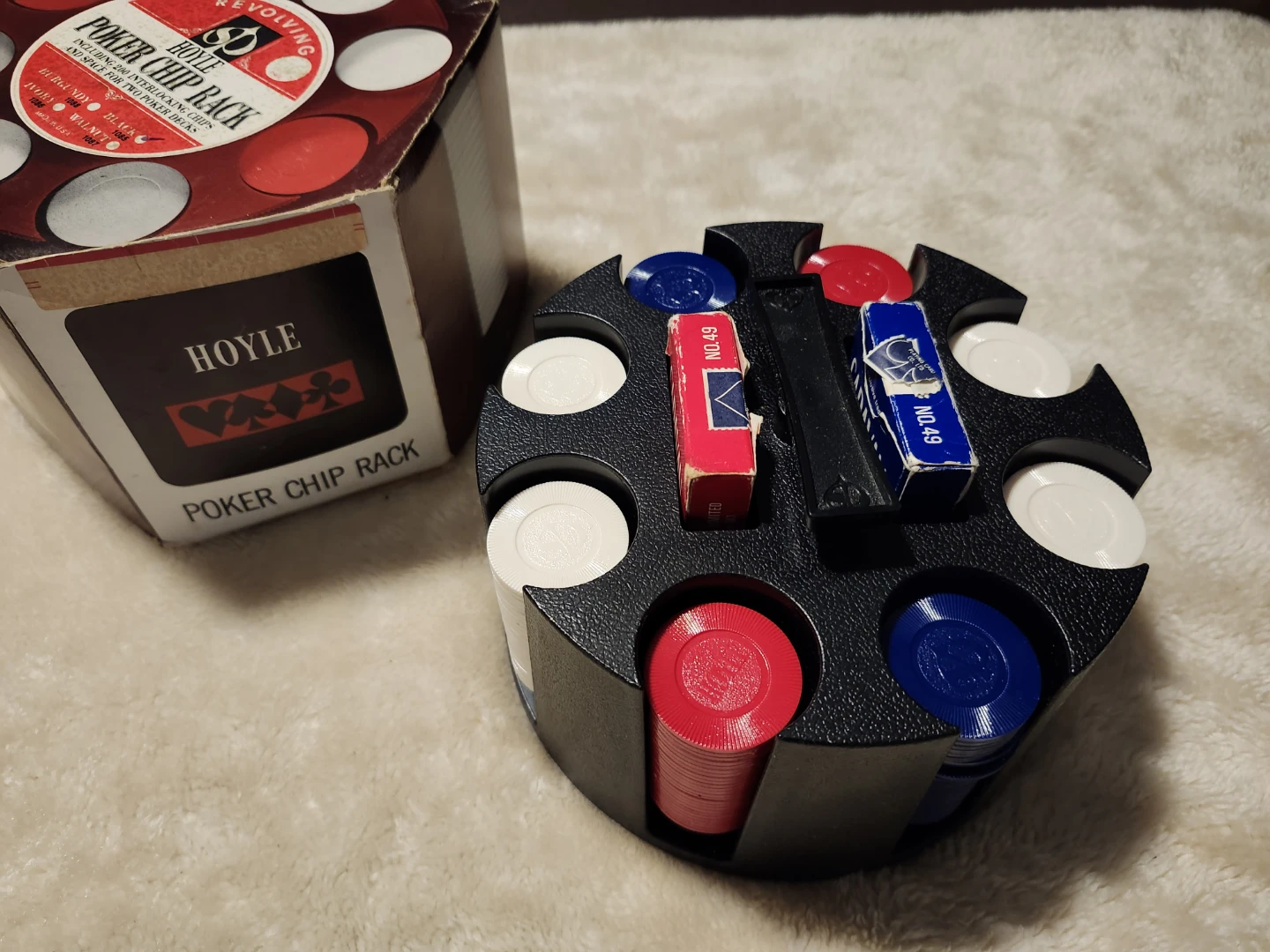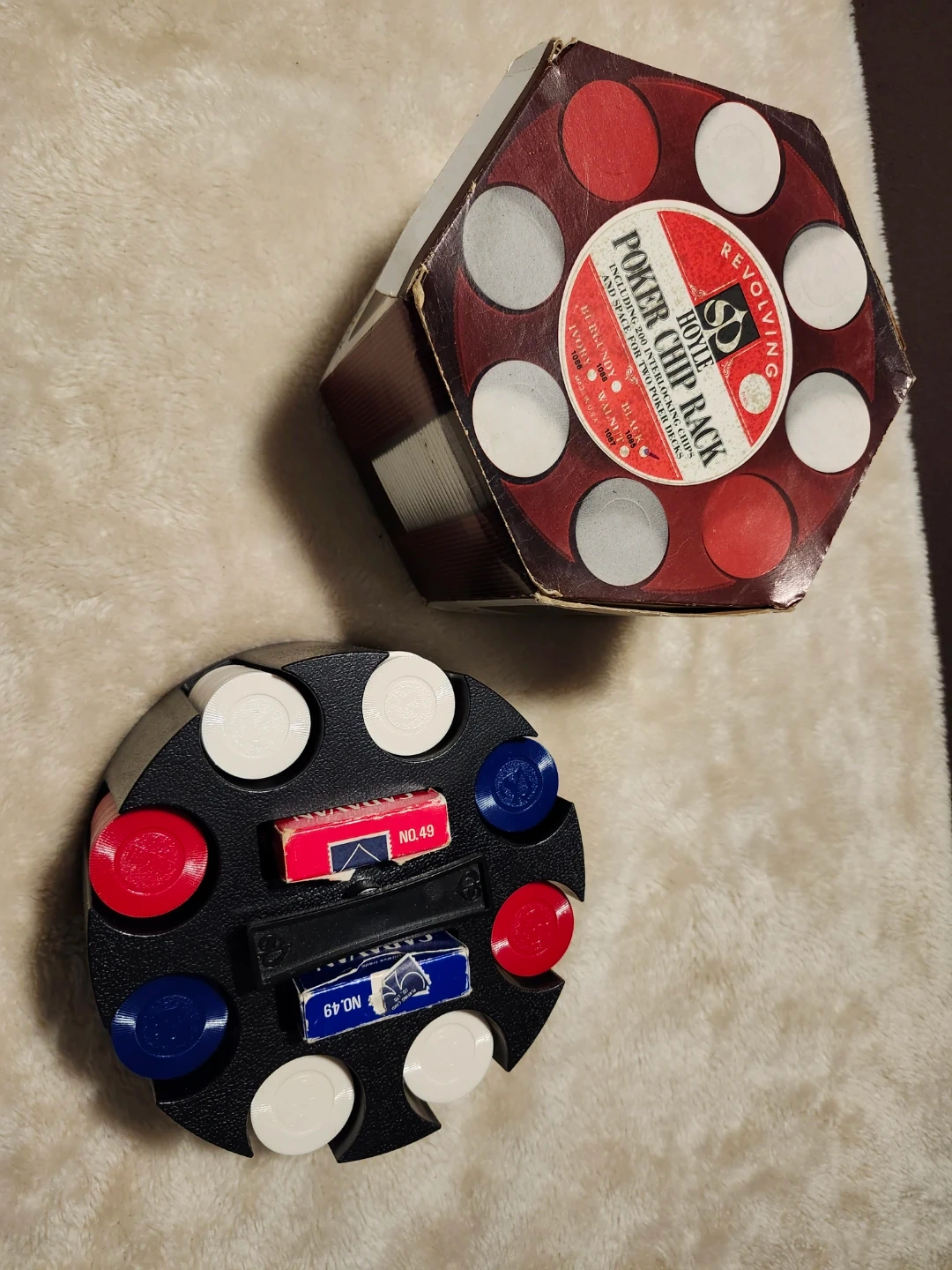 Selling an almost new vintage Hoyle revolving poker chip rack! It comes with the original box and a full set of red, white, and blue poker chips. A great addition to any game night!