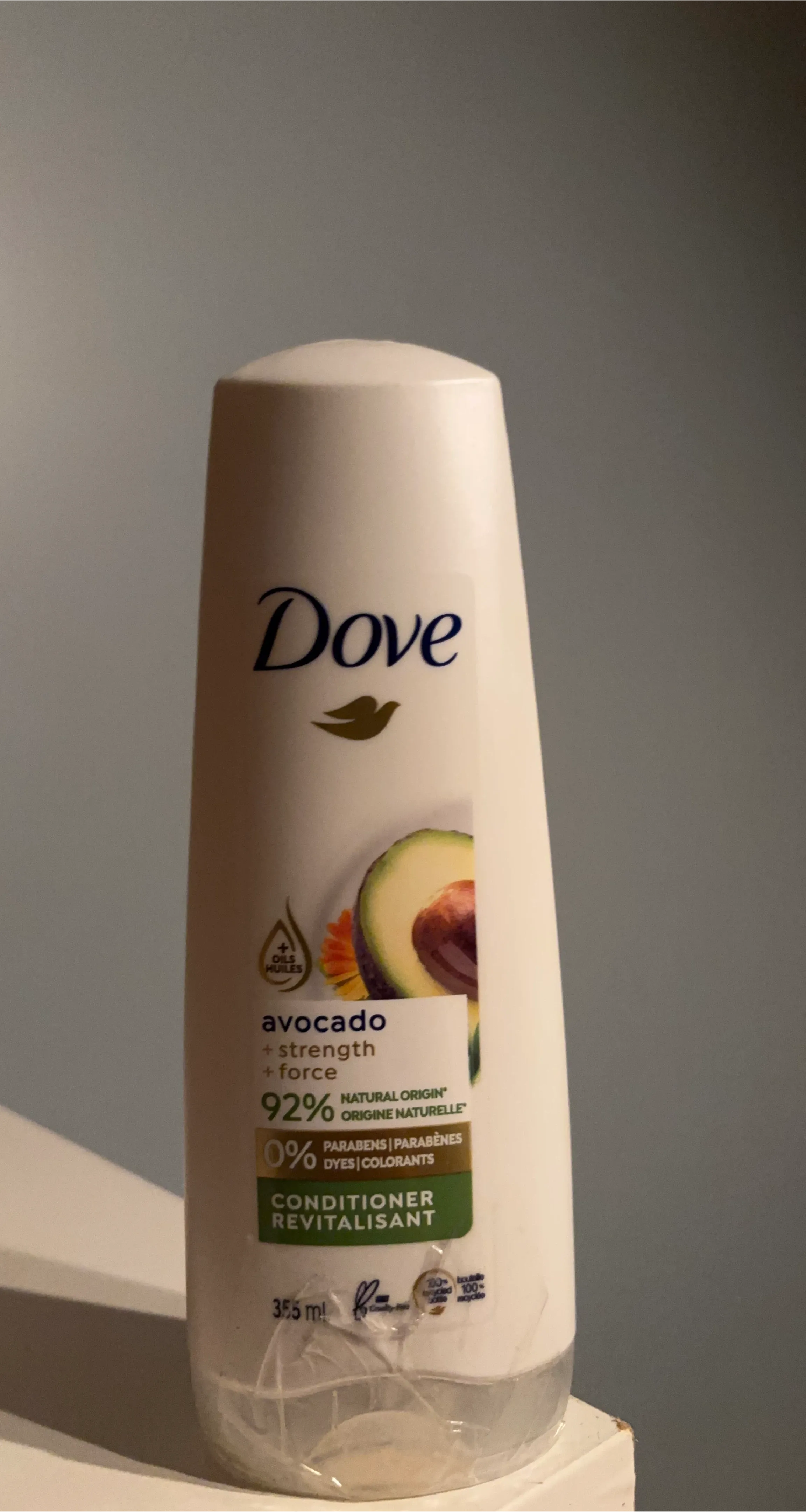 I'm selling a bottle of Dove Avocado + Strength Conditioner. It's a revitalizing conditioner with 92% natural origin ingredients and 0% parabens or dyes. It comes in a 355 ml bottle