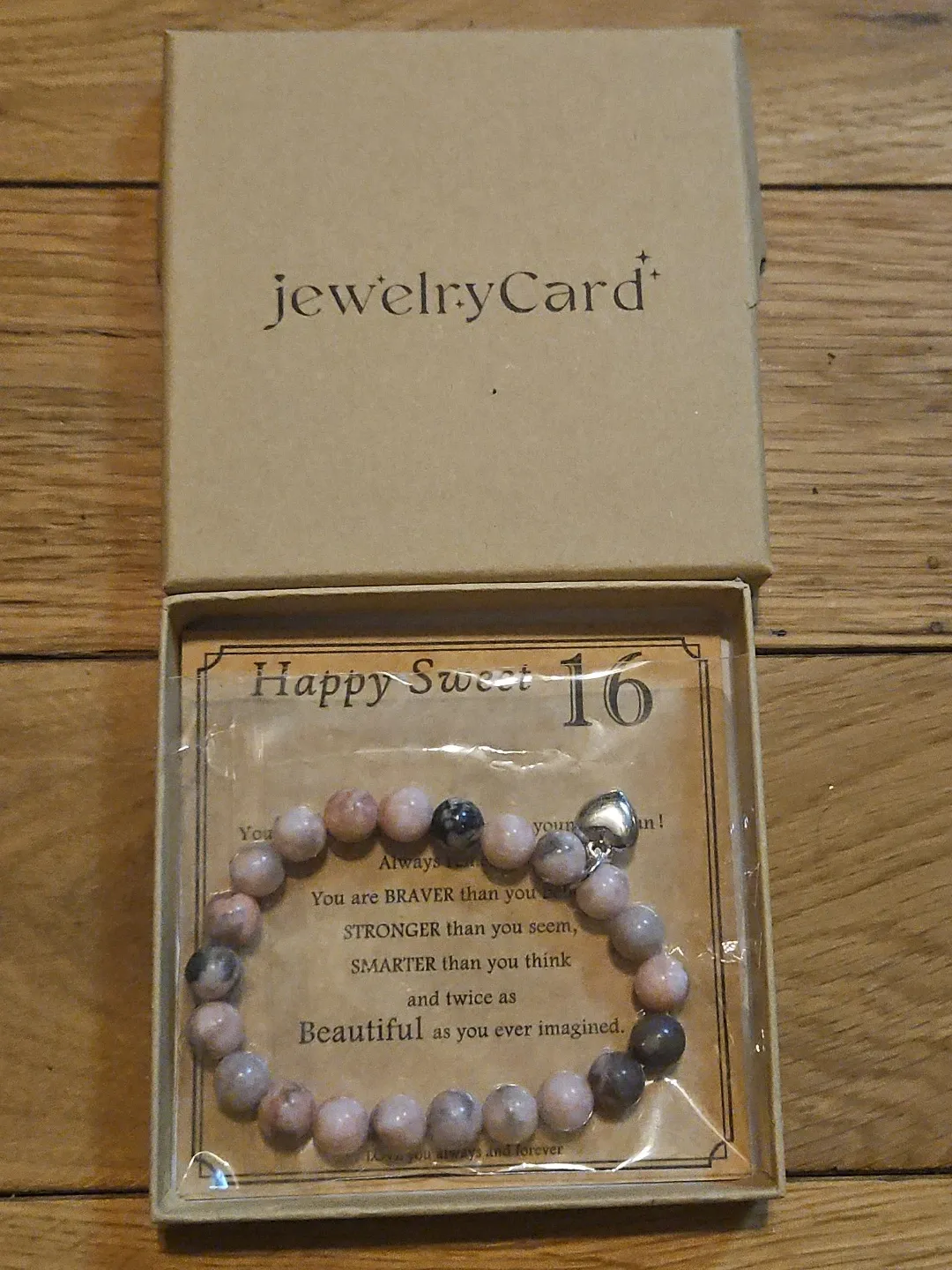 Selling a JewelryCard bracelet, perfect for a sweet sixteen celebration! The bracelet features a beautiful design with pink and gray beads and a small heart charm. The card reads, 'You are BRAVER than you, STRONGER than you seem, SMARTER than you think and twice as Beautiful as you ever imagined.' Comes in its original box