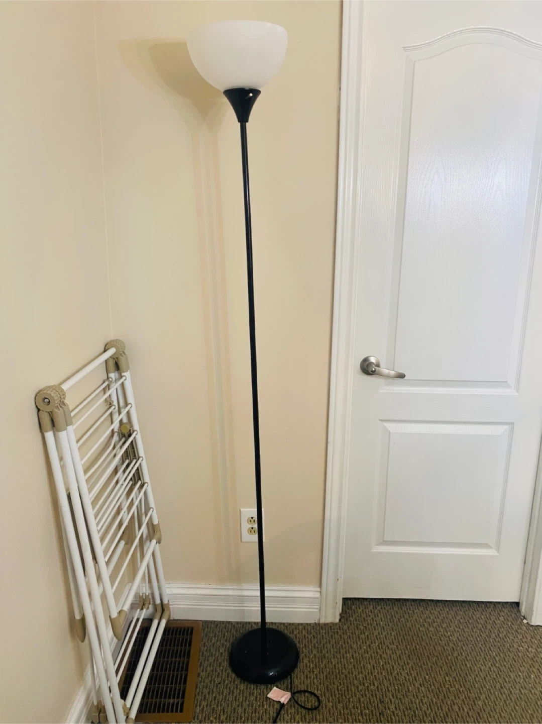 Selling a standing floor lamp with a black base and pole, and a white shade. It's in great shape and provides a nice ambient light for any room
