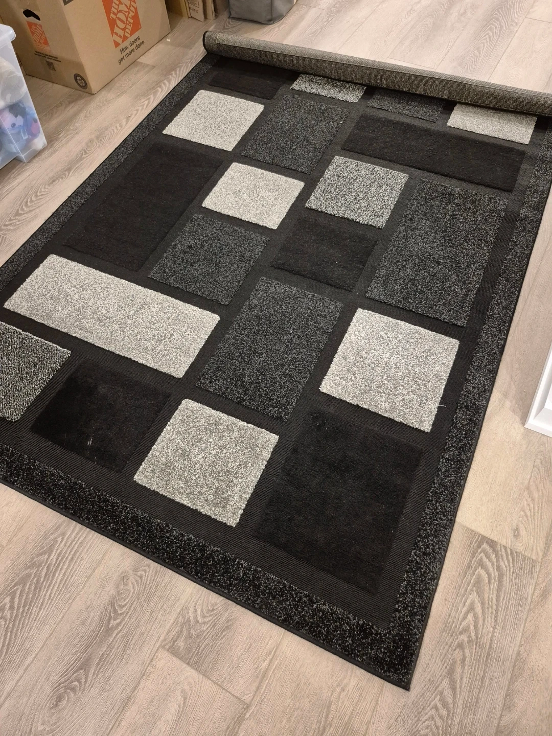 This area rug features a modern geometric pattern in shades of black and grey. It would be a stylish addition to any room in your home. It's in great condition and ready to go!