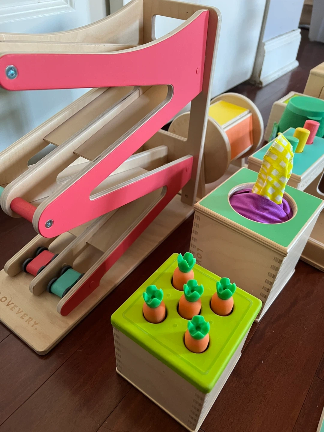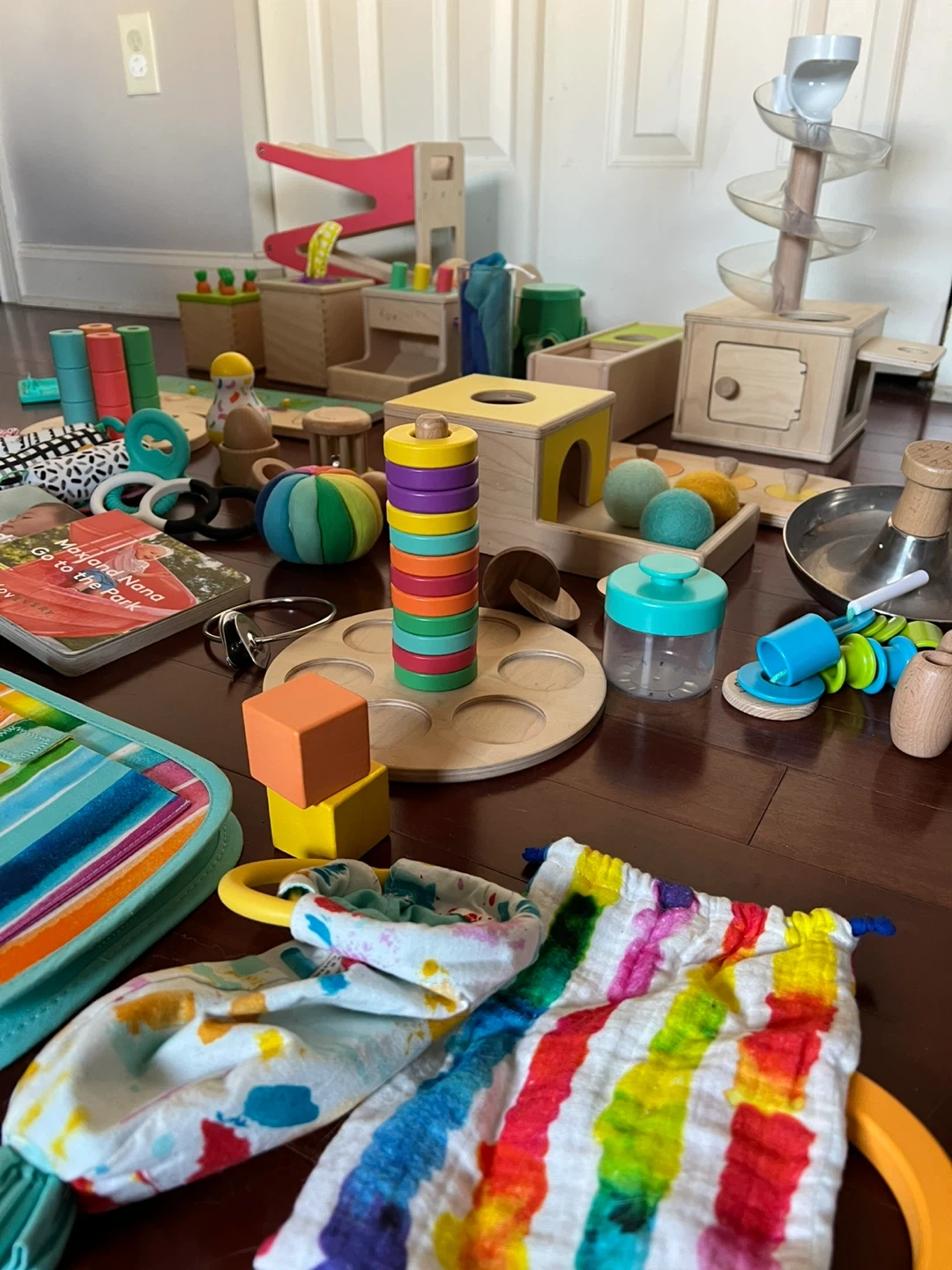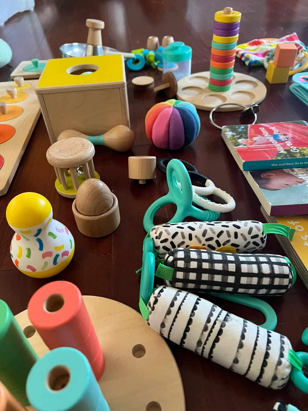 -Wooden stackers, peg boards, and sorting toys