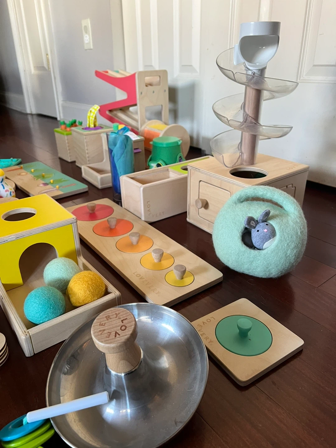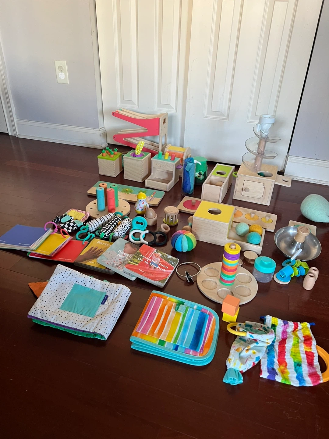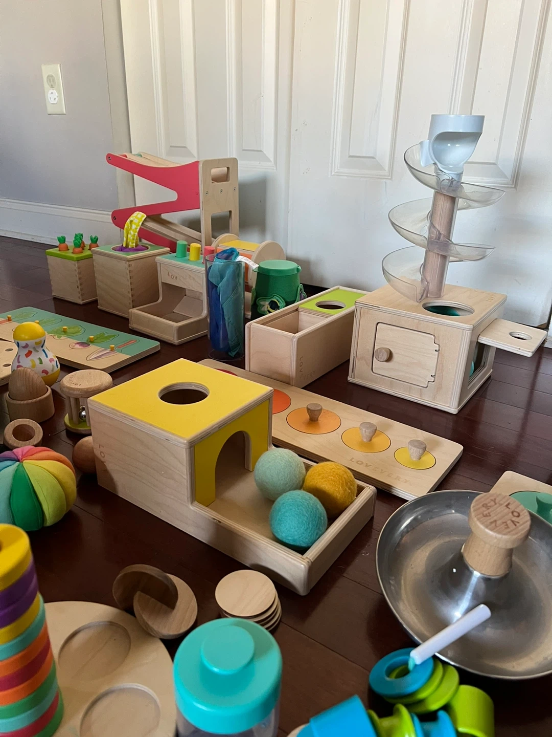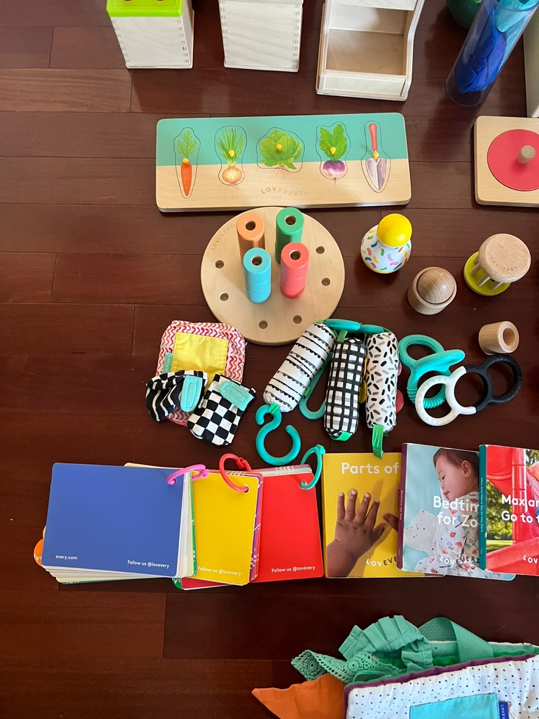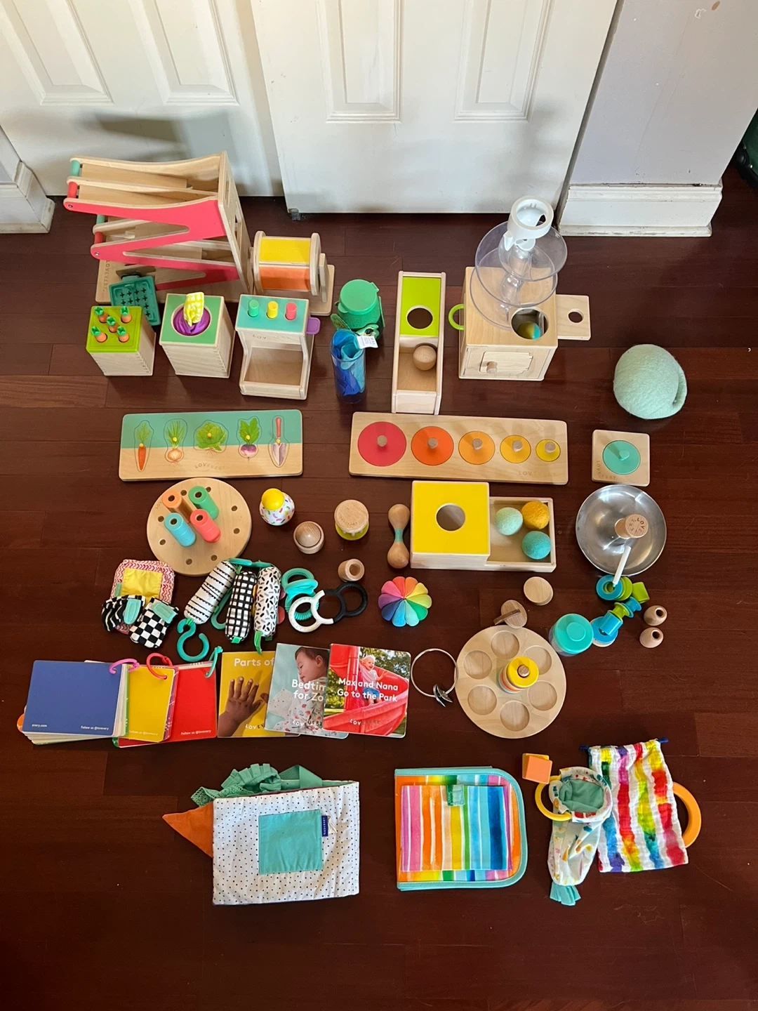 Large mixed Lovevery play set covering developmental play from newborn through toddler (approximately 0–2+ years).