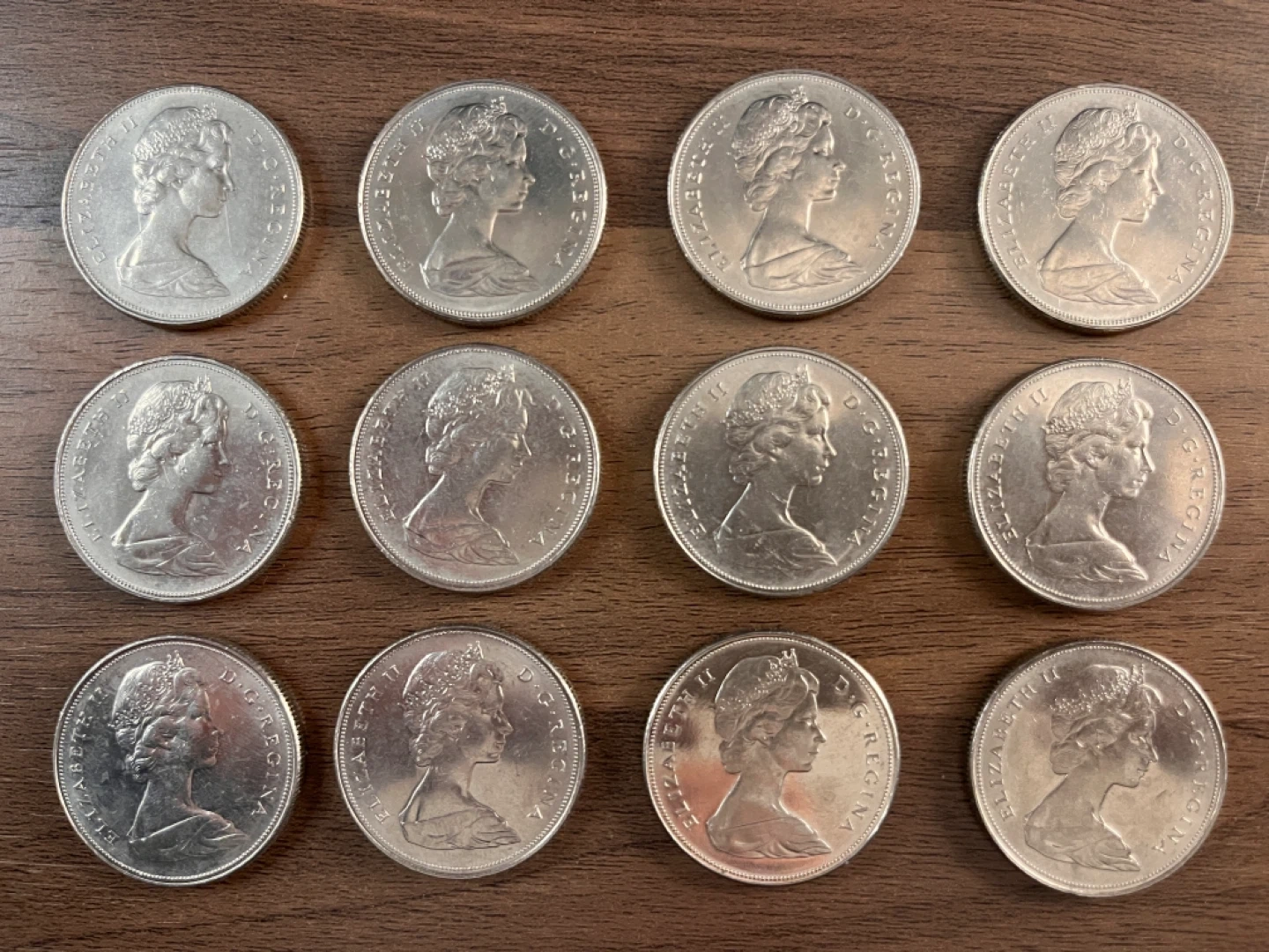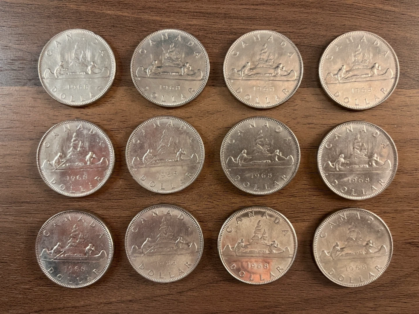 Selling a collection of 12 vintage Canadian one dollar coins from 1968. These coins feature the voyageur canoe design on one side and Queen Elizabeth II on the other.