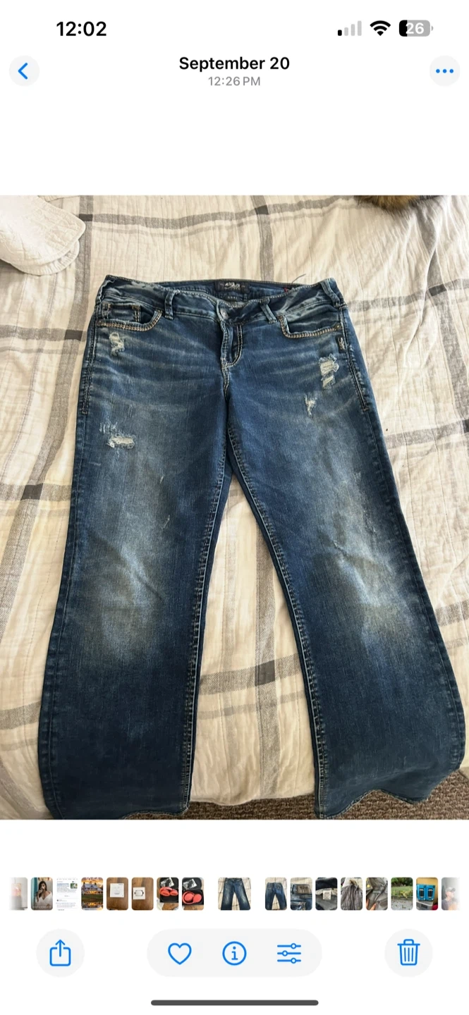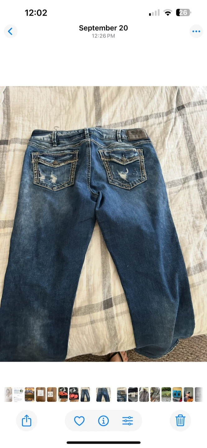 Selling a pair of Silver Jeans Co. women's denim jeans. They are in good condition and have a stylish, worn-in look. Perfect for casual wear!