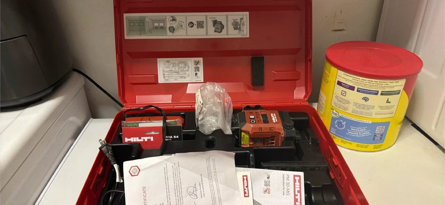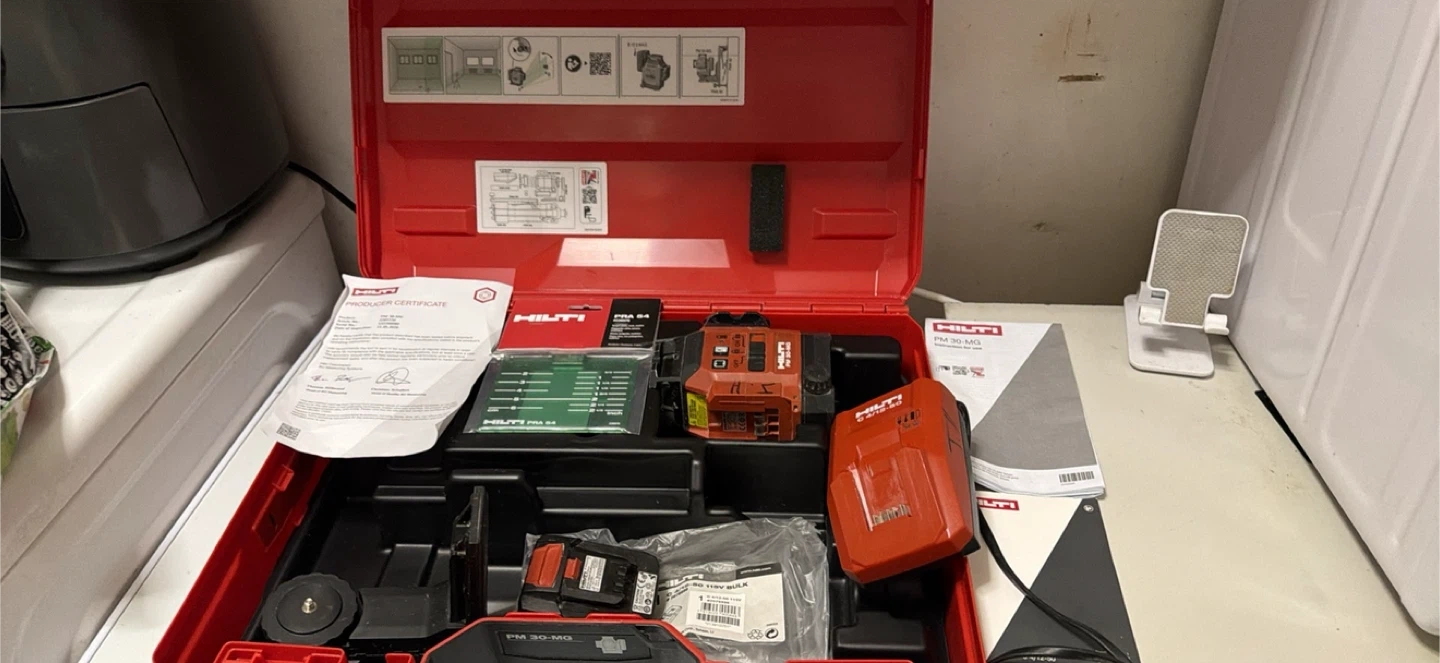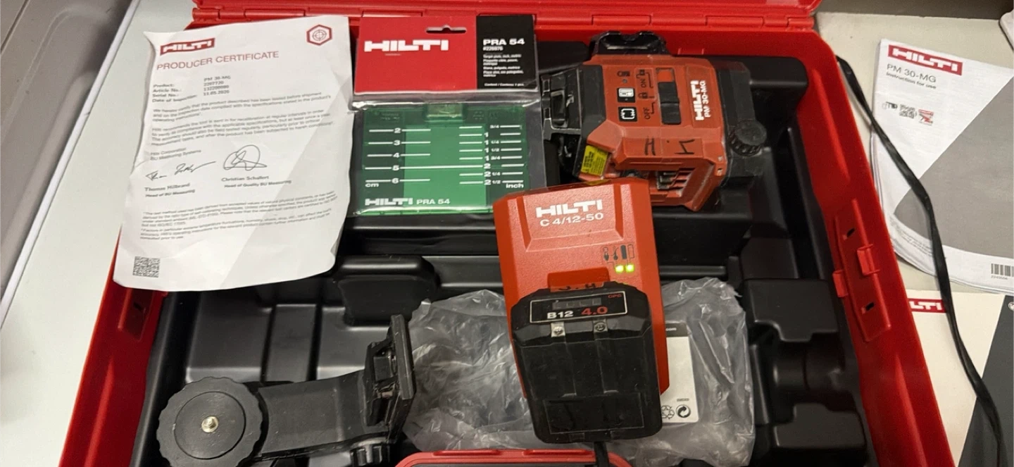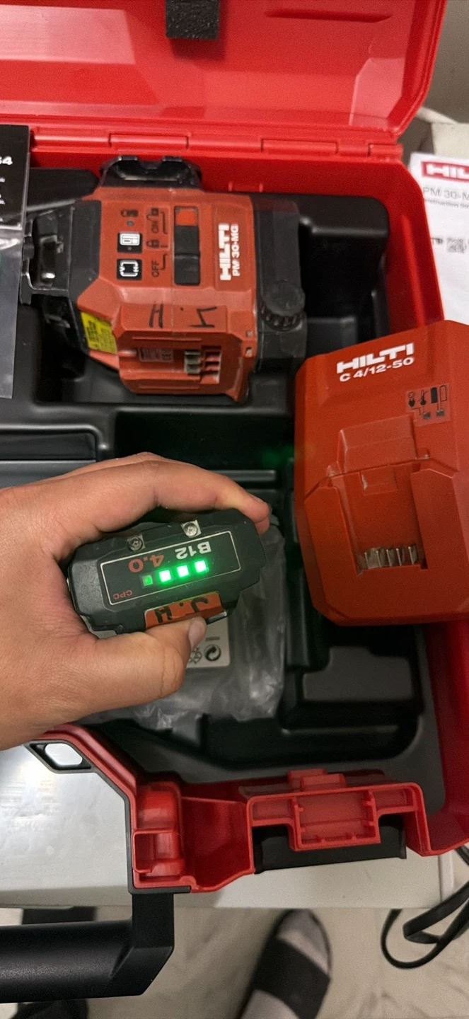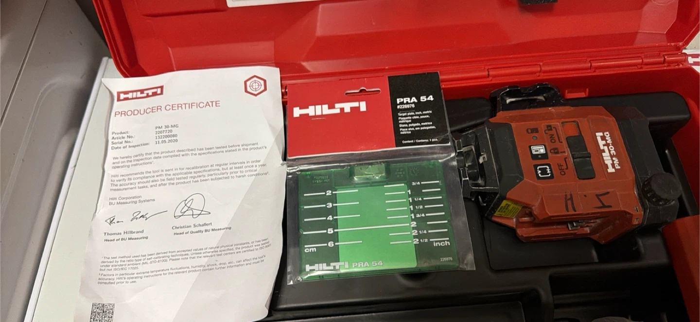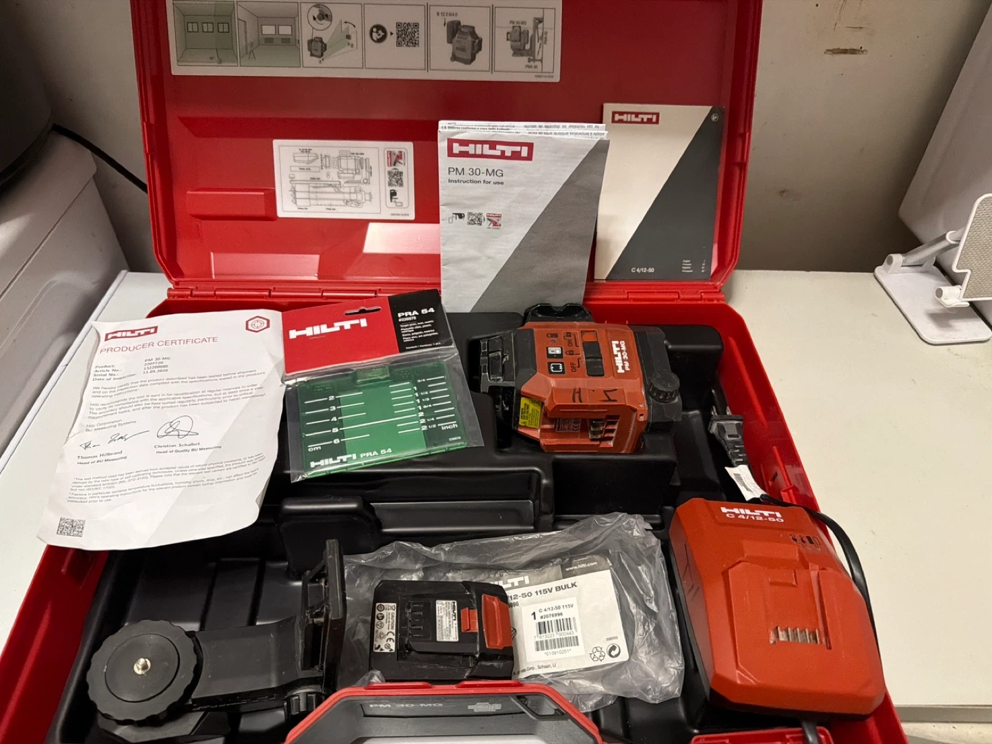 Selling a Hilti PM 30-MG multi-line laser level. It comes with the PRA 54, a producer certificate, and a C 4/12-50 115V battery. It also includes the original red carrying case, so it's easy to keep everything together and protected.