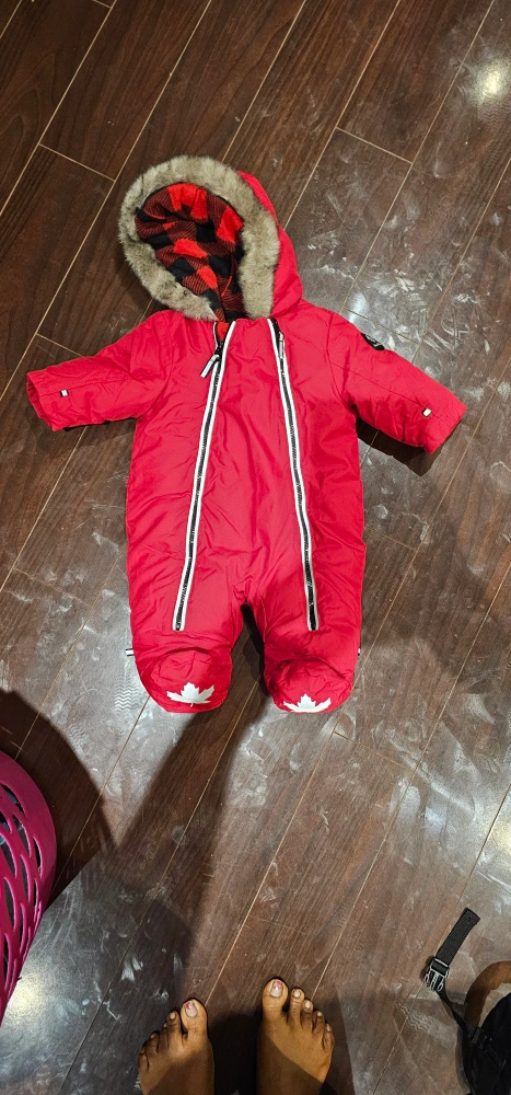 This adorable red baby snowsuit is perfect for keeping your little one warm this winter! It features a fur-trimmed hood with a red and black plaid lining. Plus, there are cute maple leaf details on the feet. It's in great condition and ready for snowy adventures!