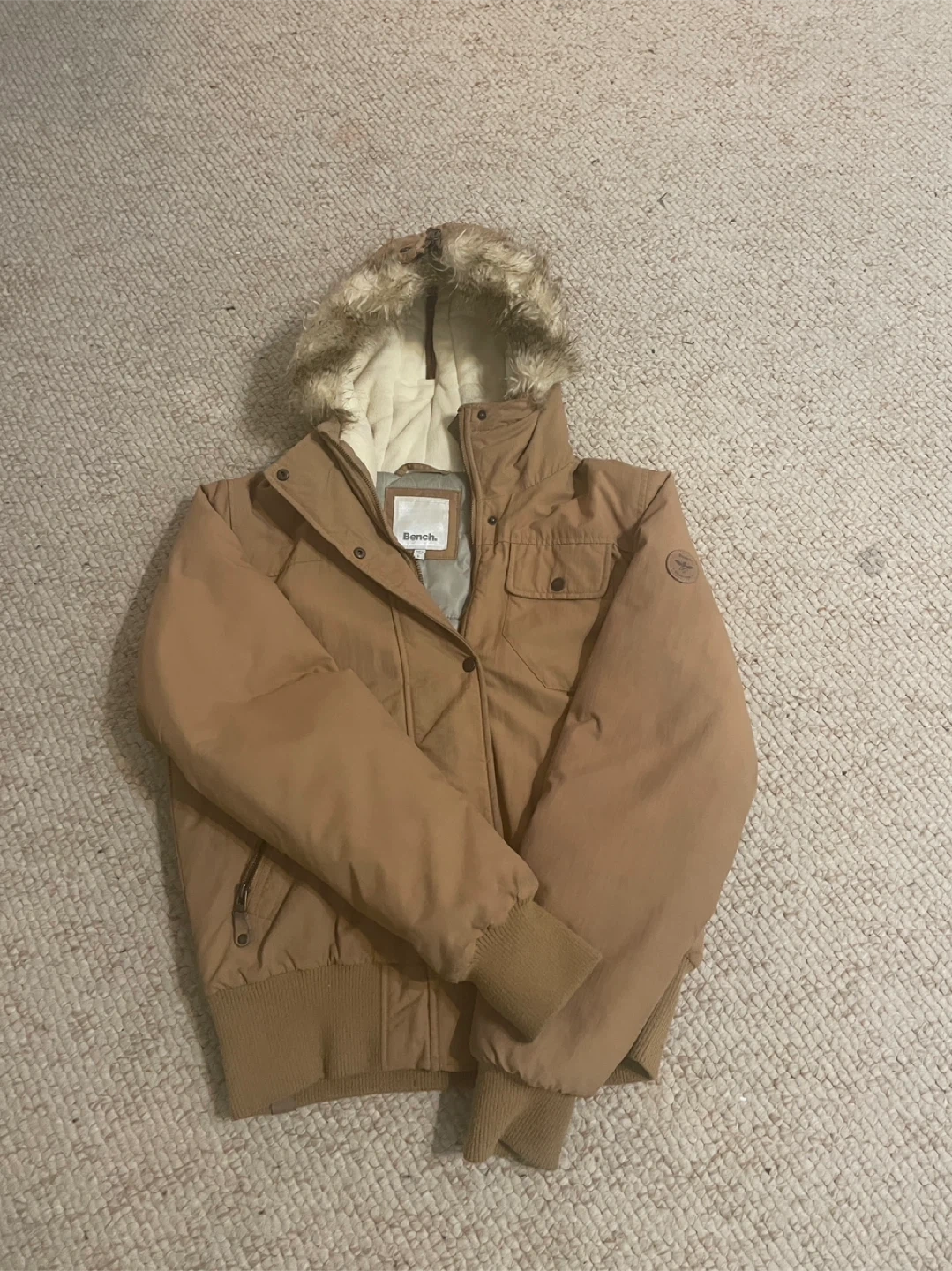 Bench. winter jacket in great condition! It's a size L and has a fur-lined hood. Perfect for staying warm during the colder months