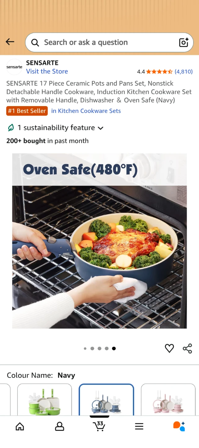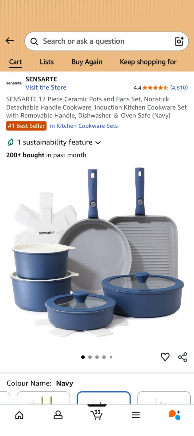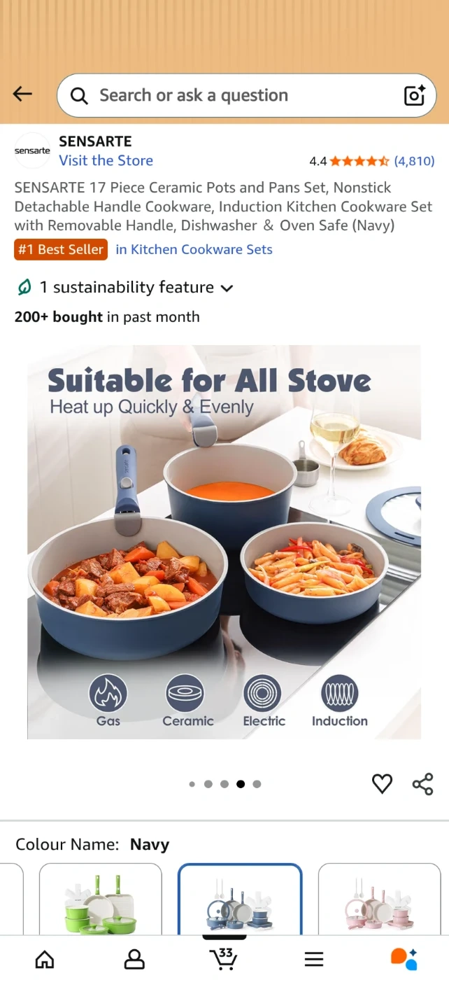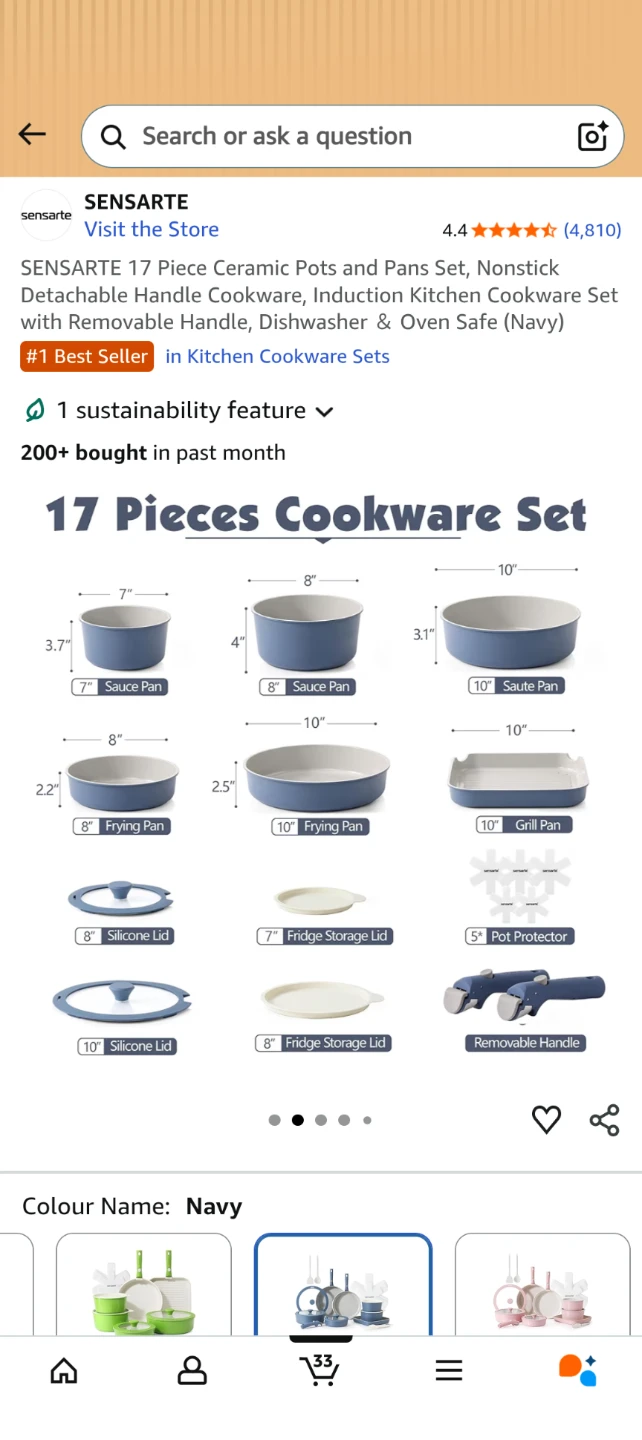 Looking to upgrade your kitchen? I'm selling a SENSARTE 17-piece ceramic cookware set in navy! This set includes pots and pans with removable handles, making storage a breeze. It's also dishwasher and oven safe. The advanced nonstick coating ensures ultra-reliable performance. Perfect for any home chef!