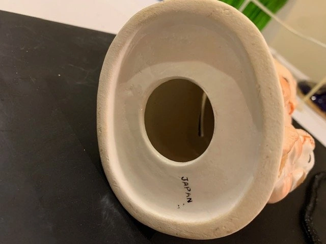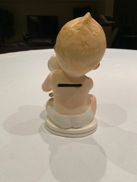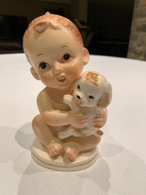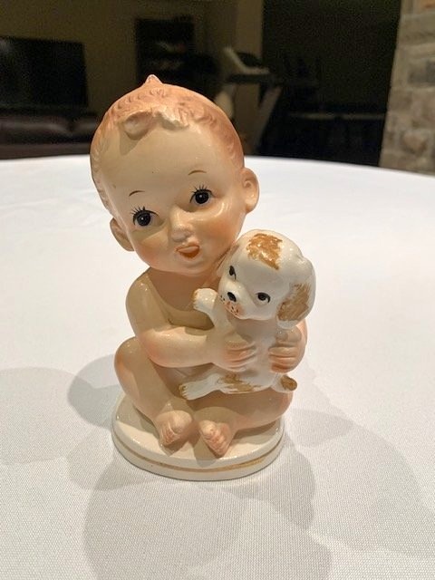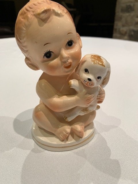 Adorable vintage piggybank featuring a baby holding a small dog.