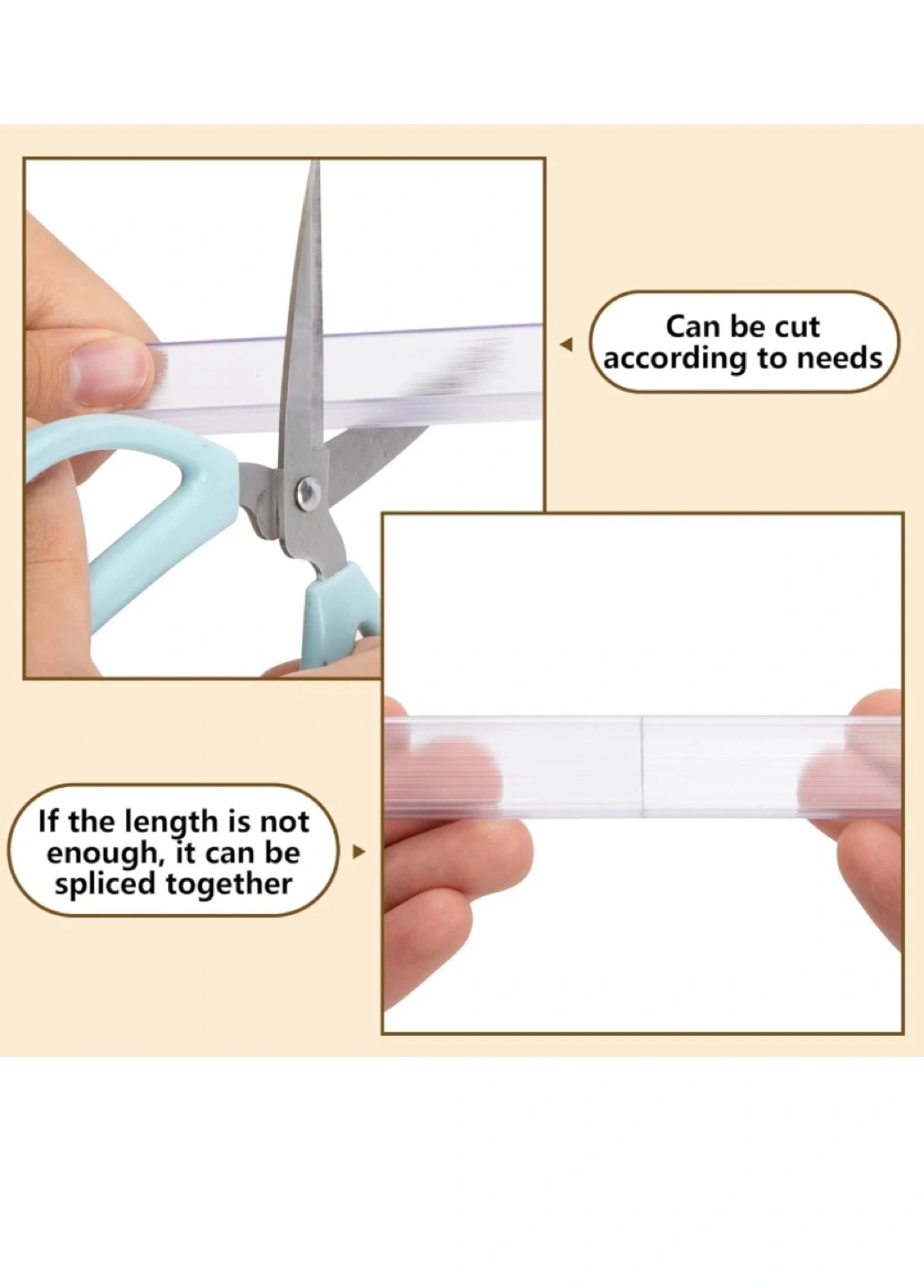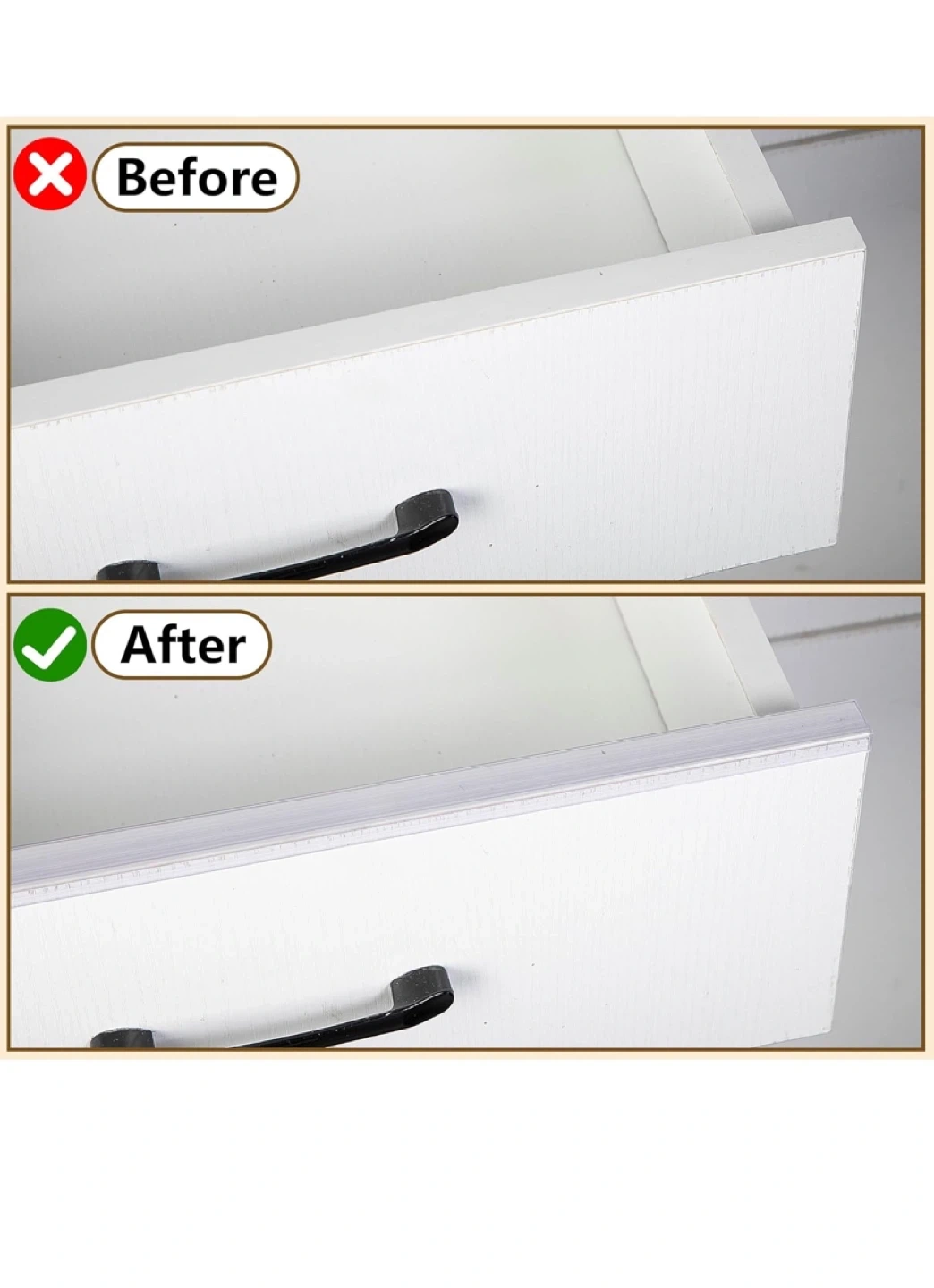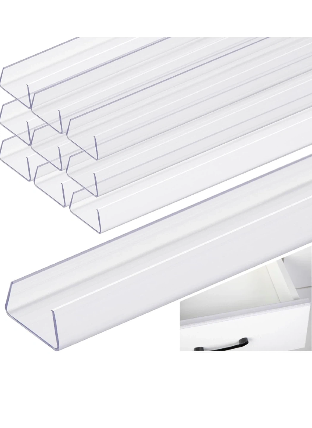 These clear drawer dividers are perfect for keeping your drawers organized! They're brand new and ready to use. The upgraded design helps to prevent damage to cabinet doors during installation. They're also easy to cut to the size you need or splice together if you need a longer length. They are only applicable to flat edges with a width of 3/4 inch.