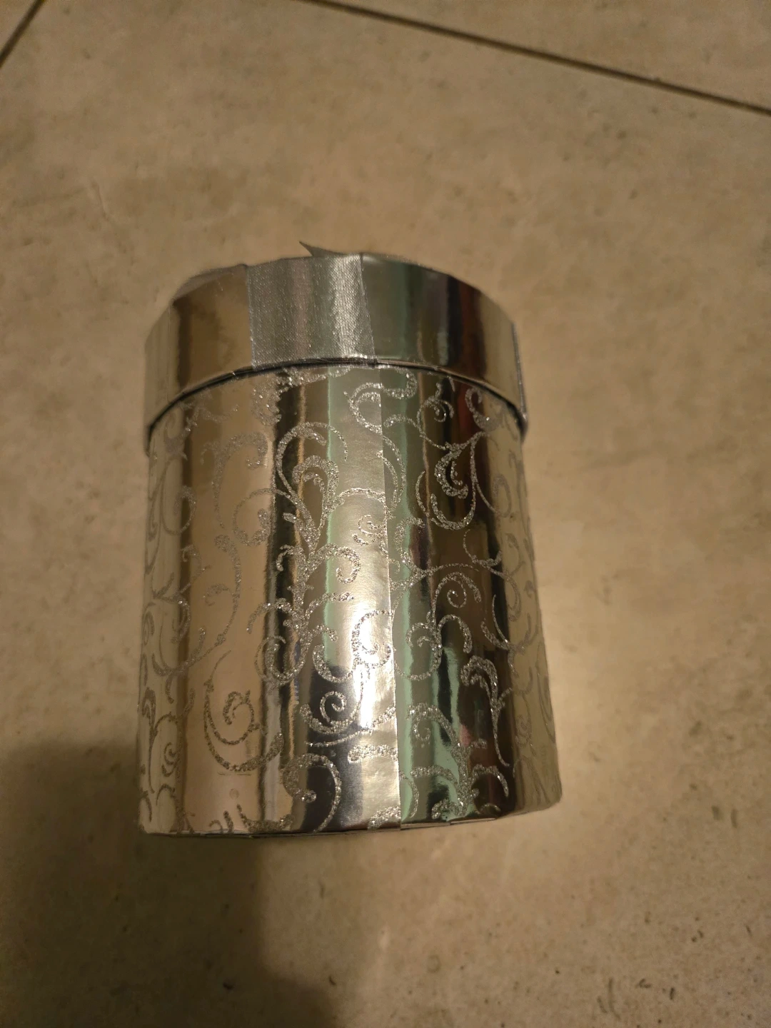 Selling a silver gift box with a lid. It has a decorative pattern and a silver ribbon on top. Perfect for small gifts or storage. $2 or free with any other purchase!