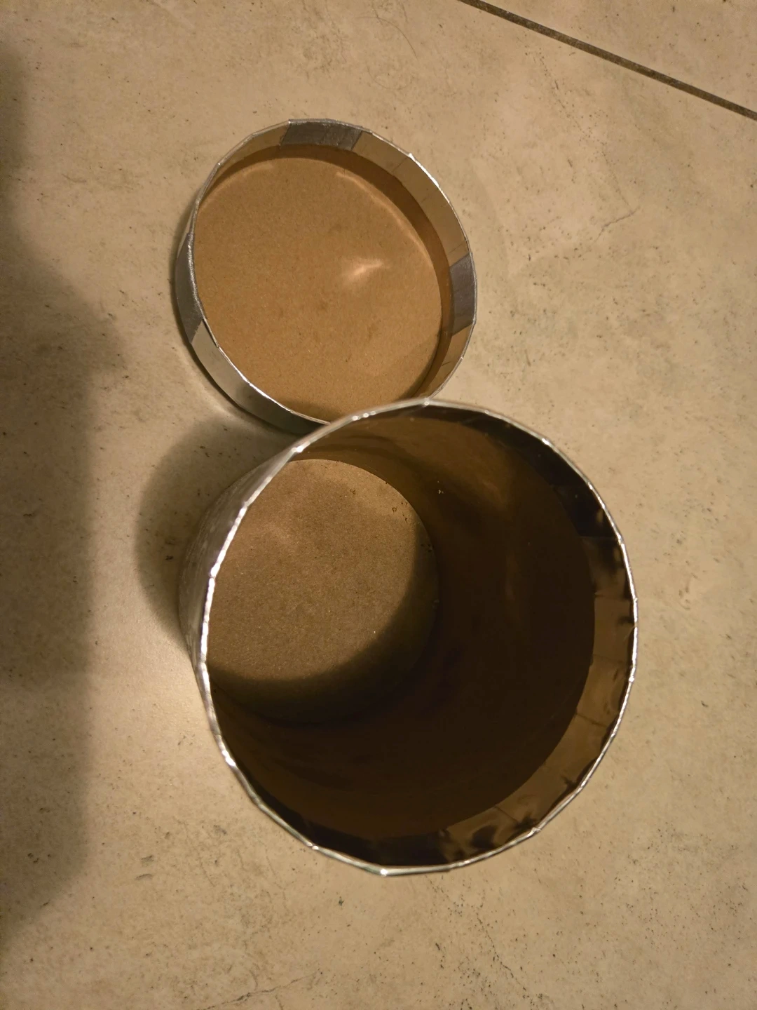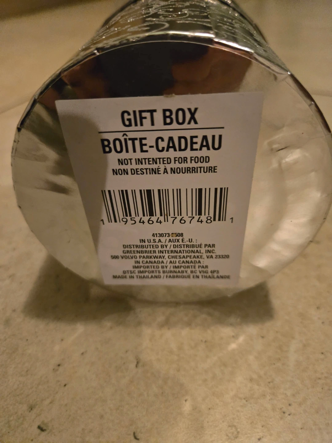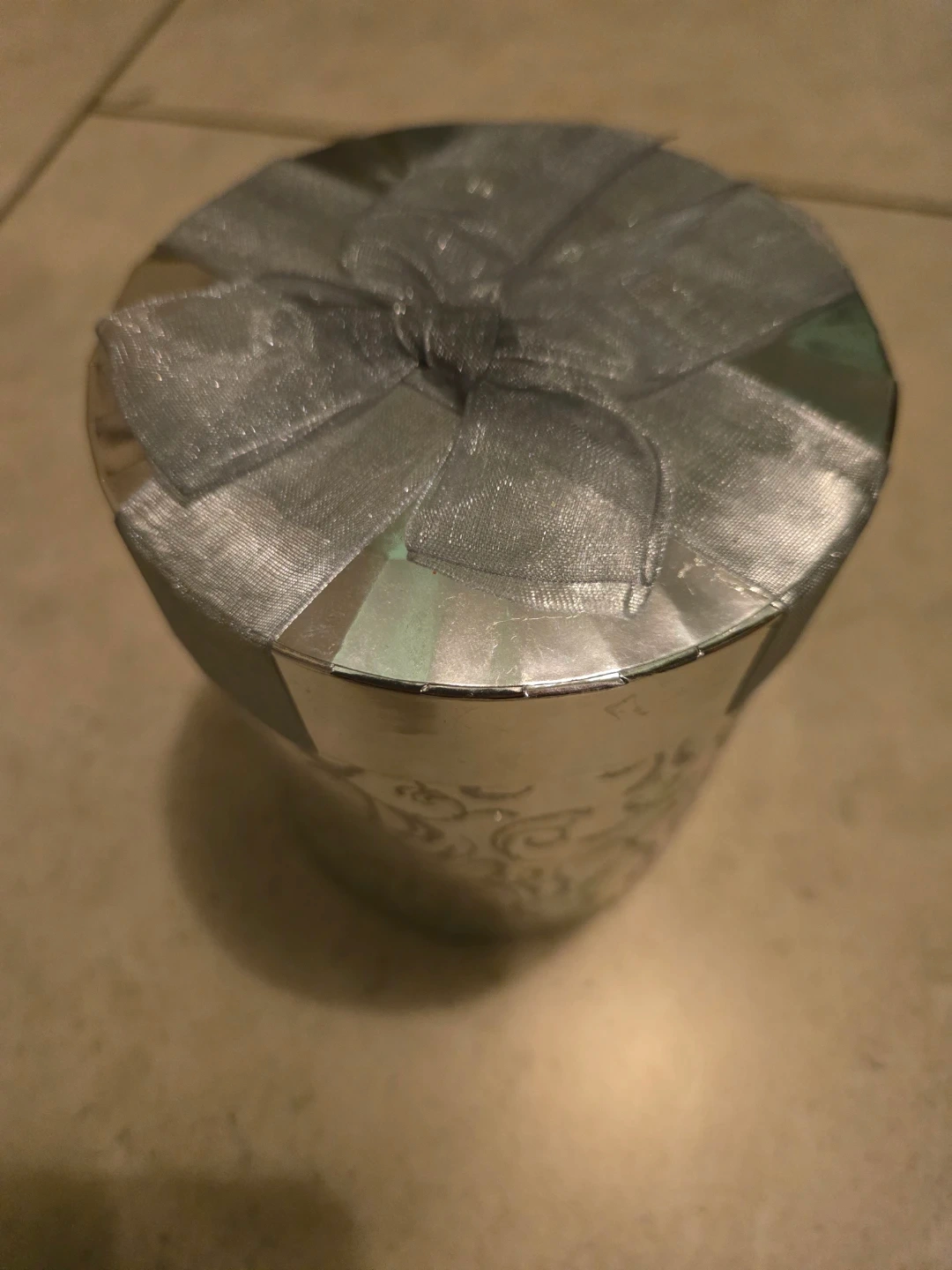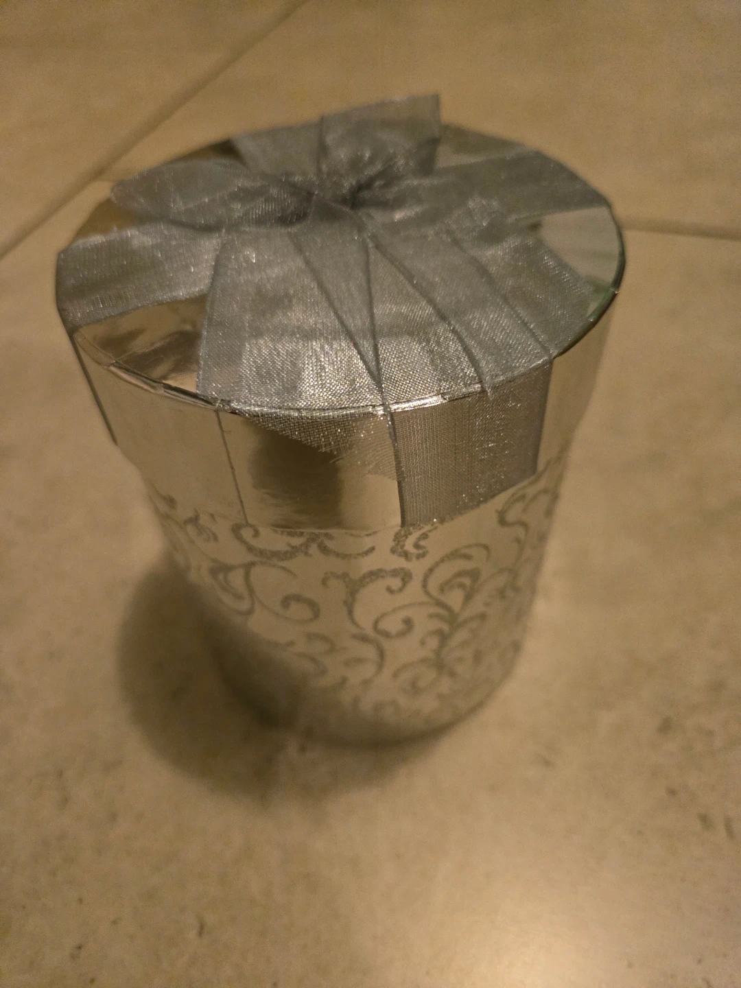 Selling a silver gift box with a lid. It has a decorative pattern and a silver ribbon on top. Perfect for small gifts or storage. $2 or free with any other purchase!