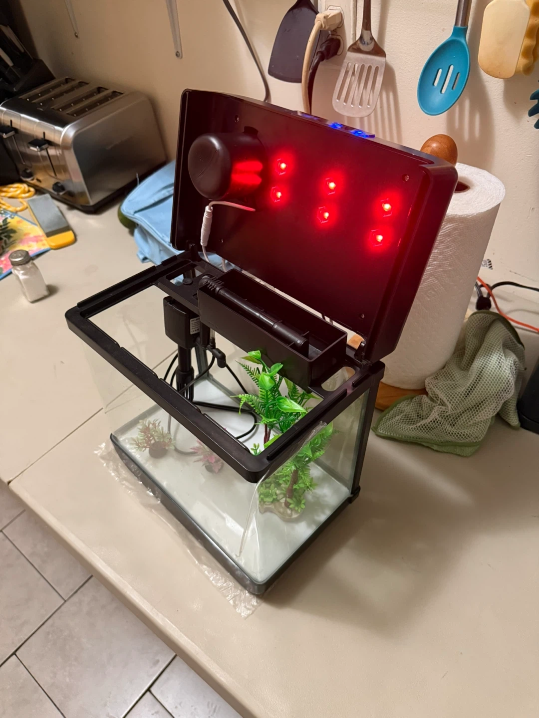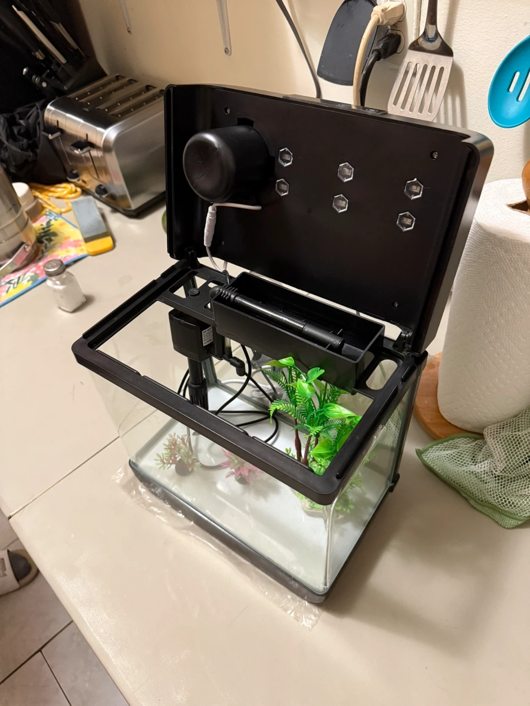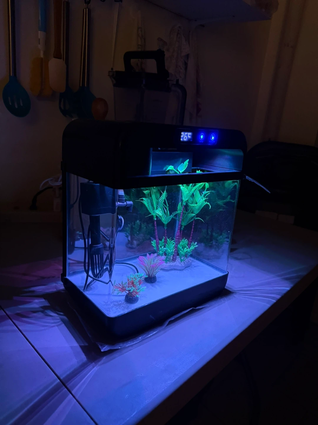 Selling a small aquarium with built-in LED lighting. It's in great condition and perfect for a small space. The tank has a filter and a lid with adjustable lighting options. It's all ready for some fish!