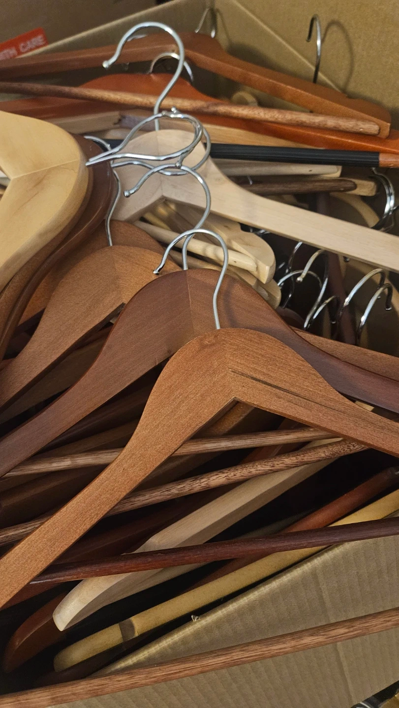 Selling 75 wooden clothes hangers! They come in different shades of brown and are perfect for organizing your closet. Great for keeping your clothes wrinkle-free and looking their best