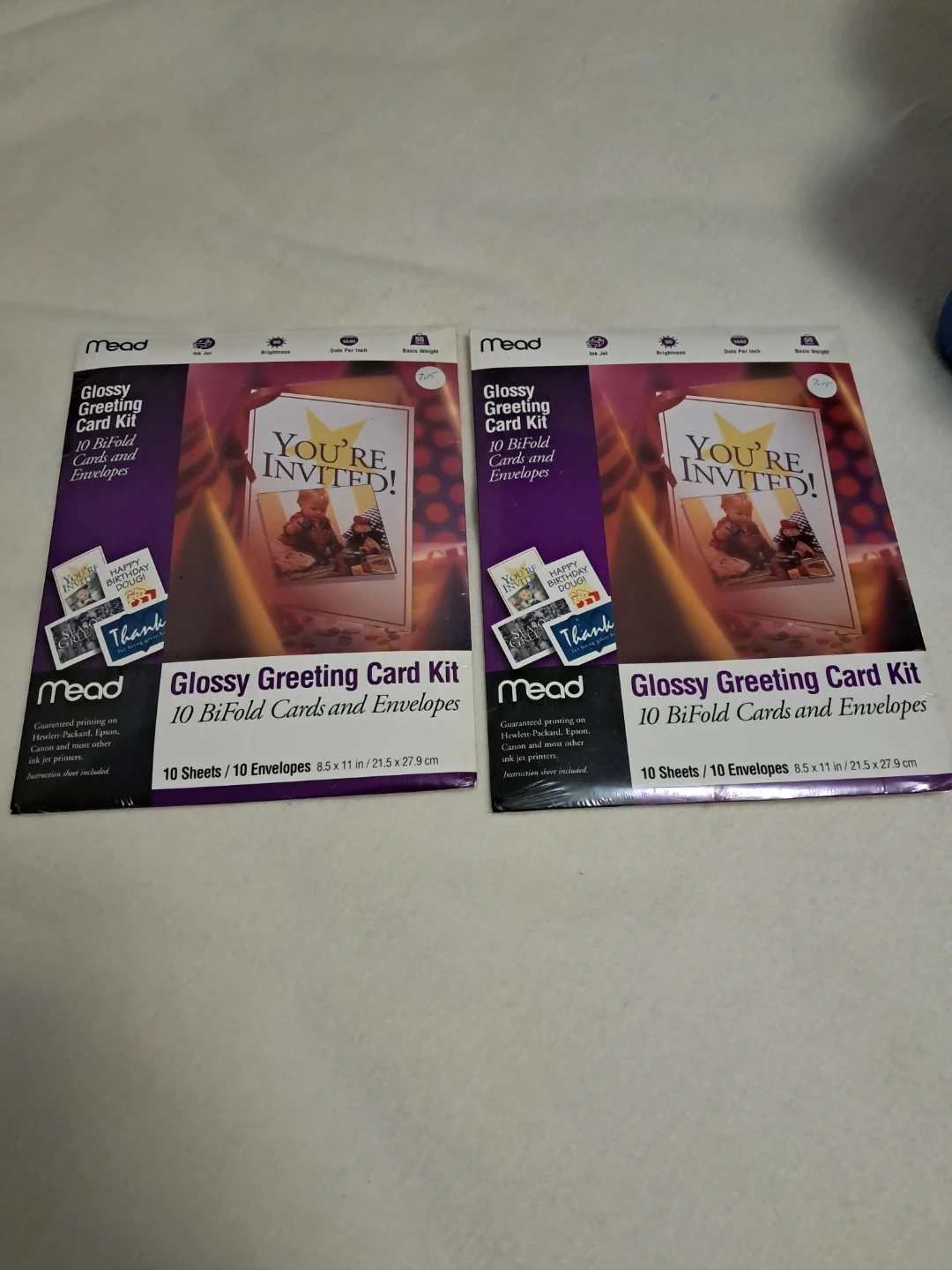 Selling two brand new Mead Glossy Greeting Card Kits! Each kit includes 10 bi-fold cards and envelopes. The size is 8.5 x 11 inches / 21.5 x 27.9 cm. Guaranteed printing on Hewlett-Packard, Epson, Canon and most other ink jet printers. Instruction sheet included
