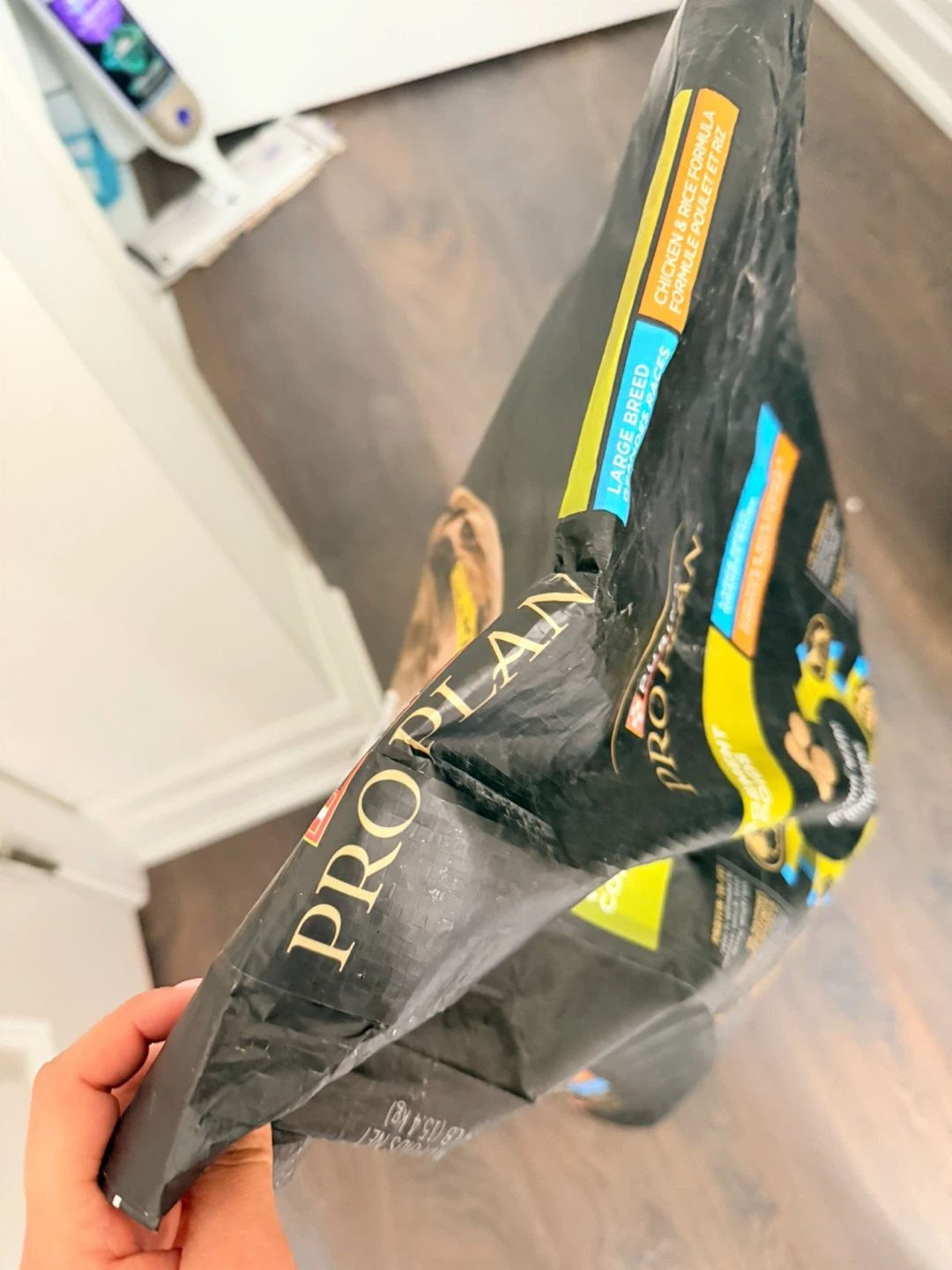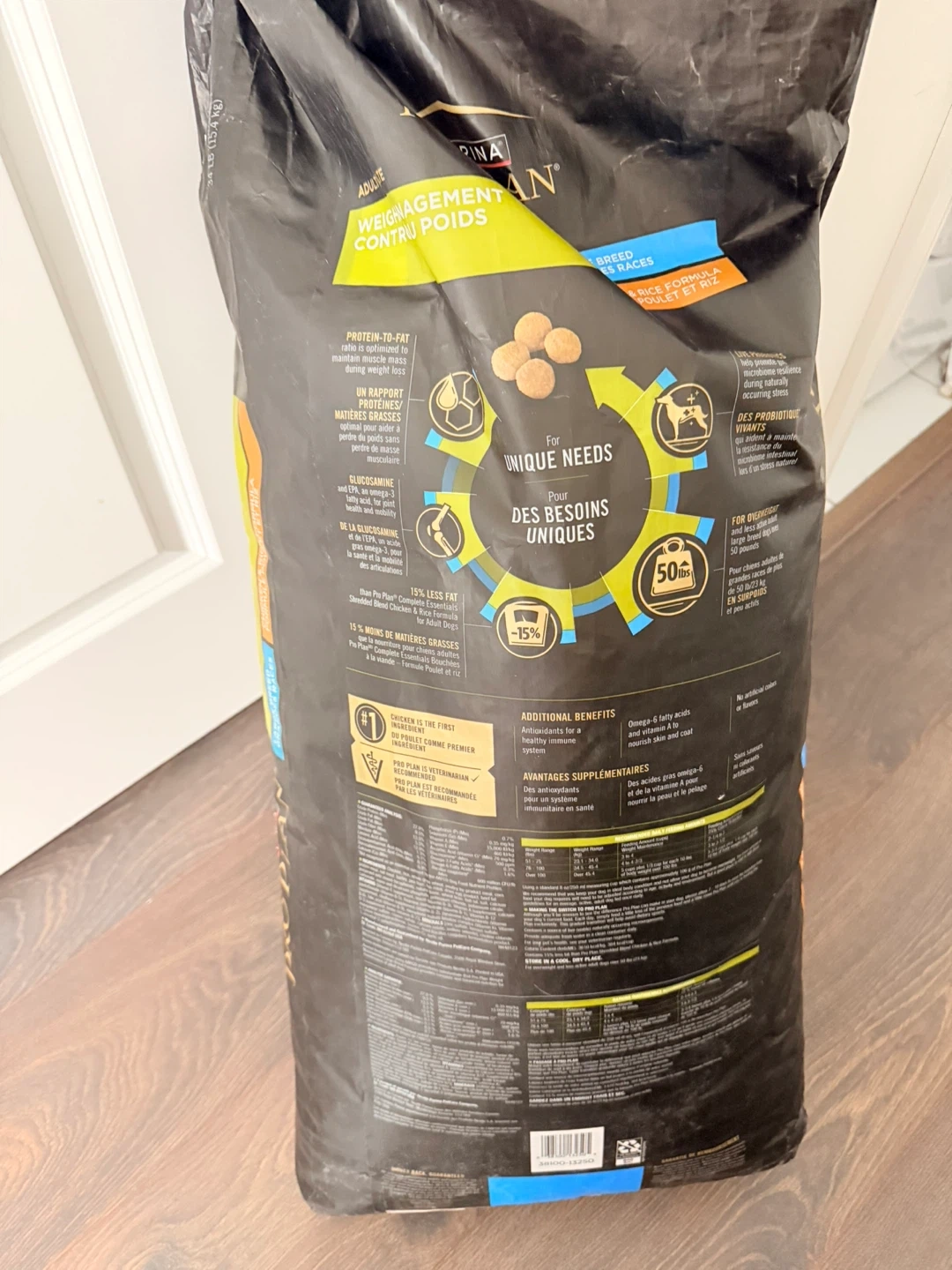Selling a bag of Purina Pro Plan Adult Weight Management dog food for large breed dogs. It's chicken and rice flavour. The bag is 34 lbs. It is formulated for unique needs and is 15% less fat.