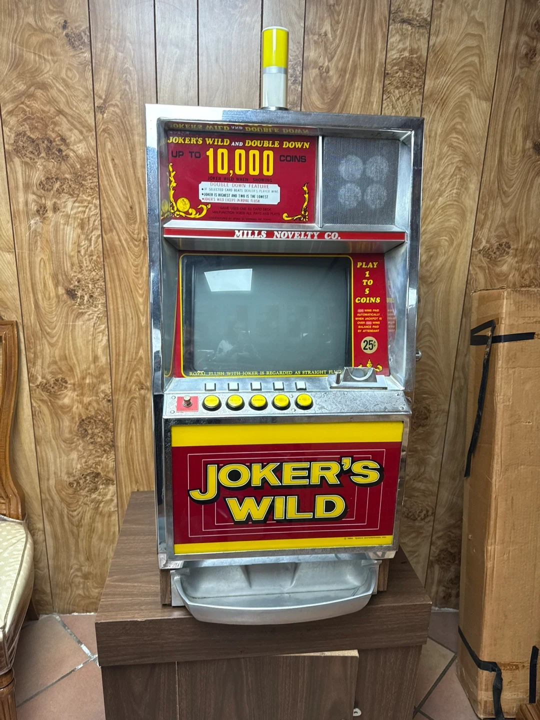 Selling a Mills Novelty Co. Joker's Wild slot machine. It appears to be in good condition. It also comes with the B-9 Cabinet illustrated parts catalog.