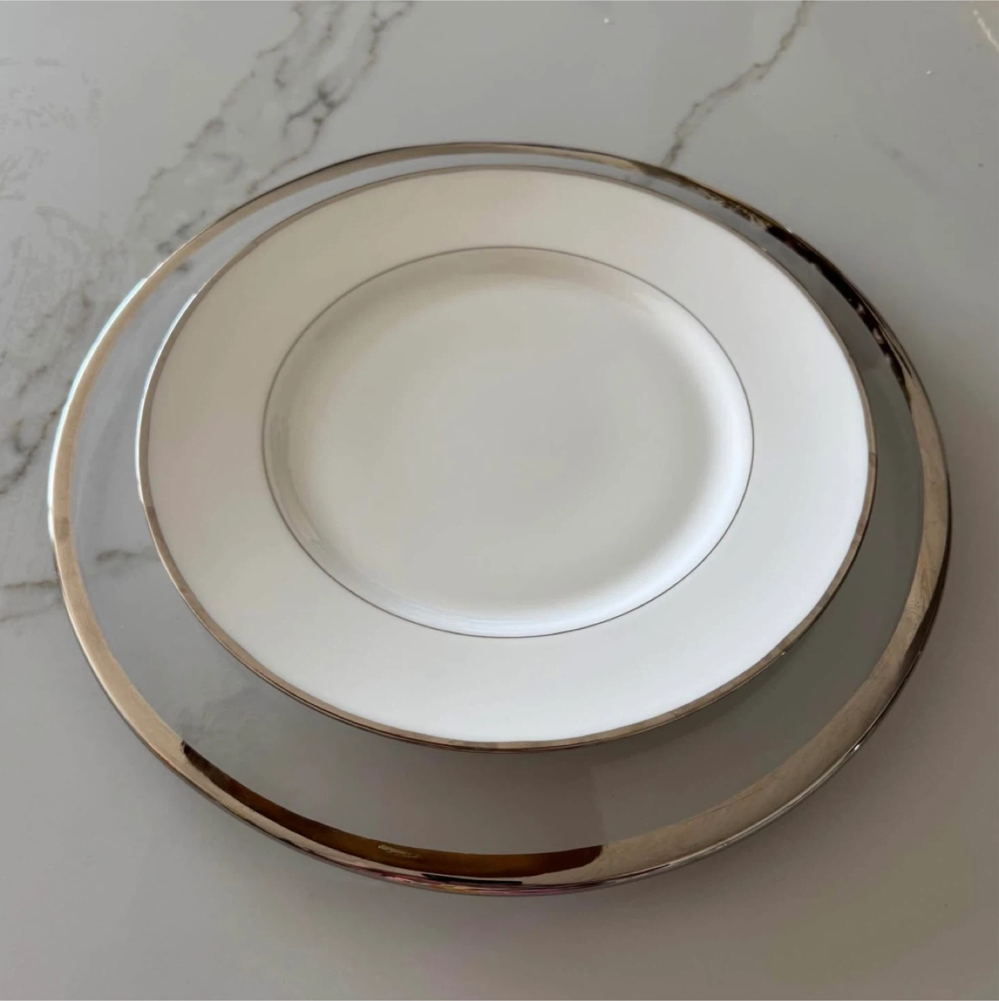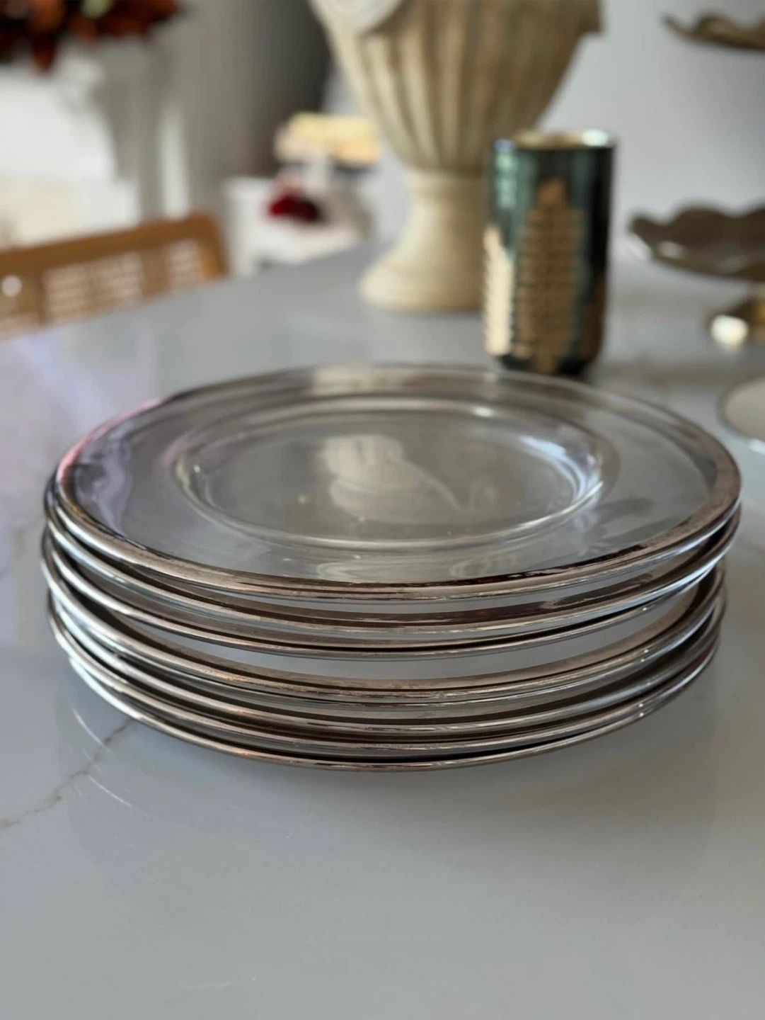 Set of 8 I.V.V. Aria round glass charger / service plates with platinum rim (32 cm).