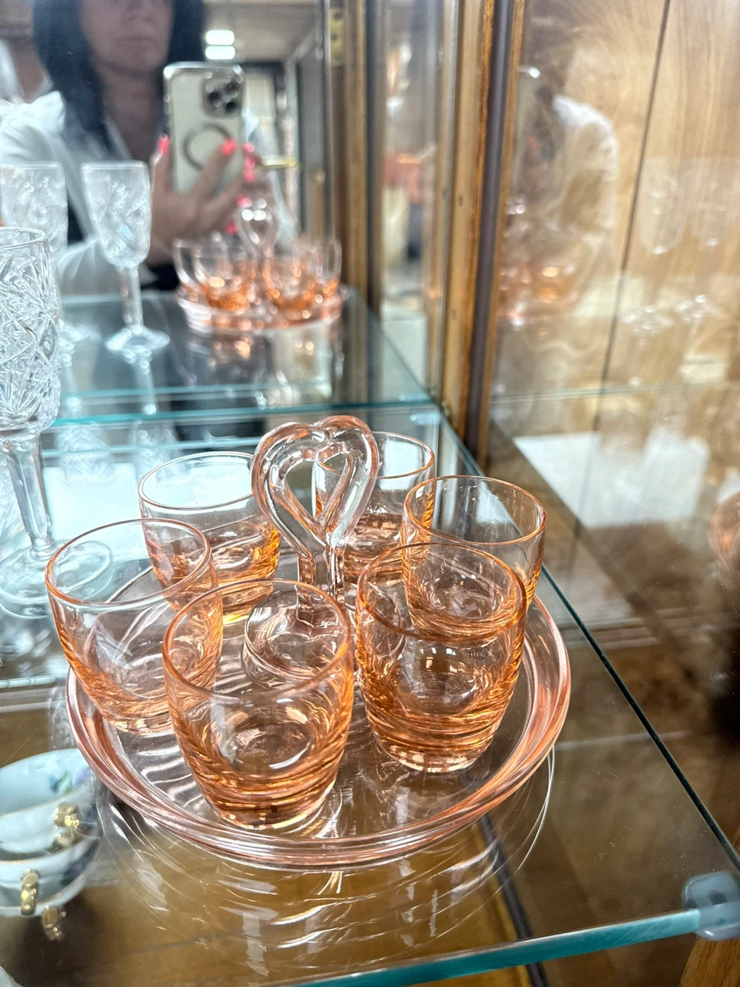 Selling a beautiful vintage pink depression glass cordial set. Includes a heart-shaped handle server and six small glasses. This set is perfect for adding a touch of vintage charm to your home!