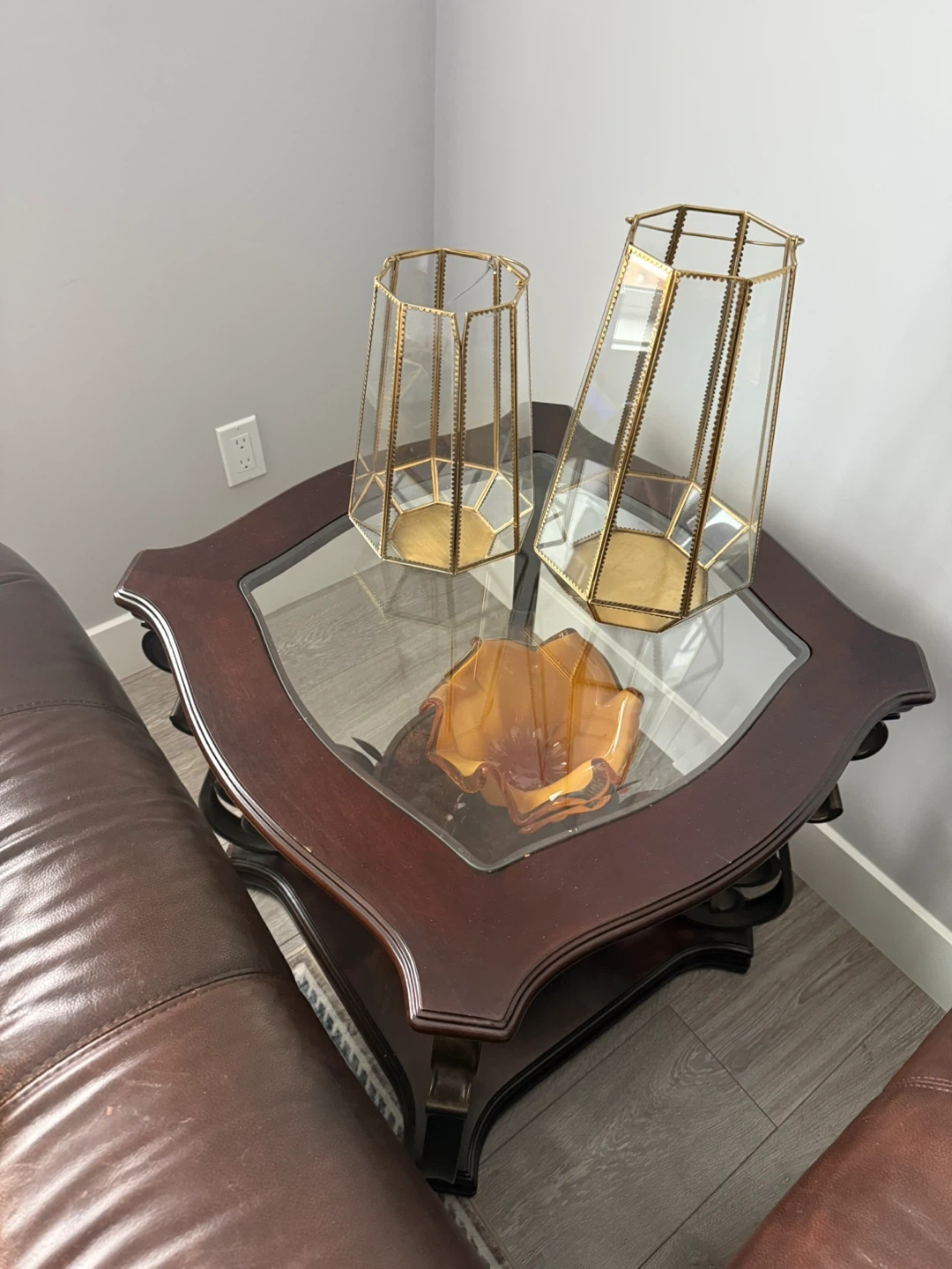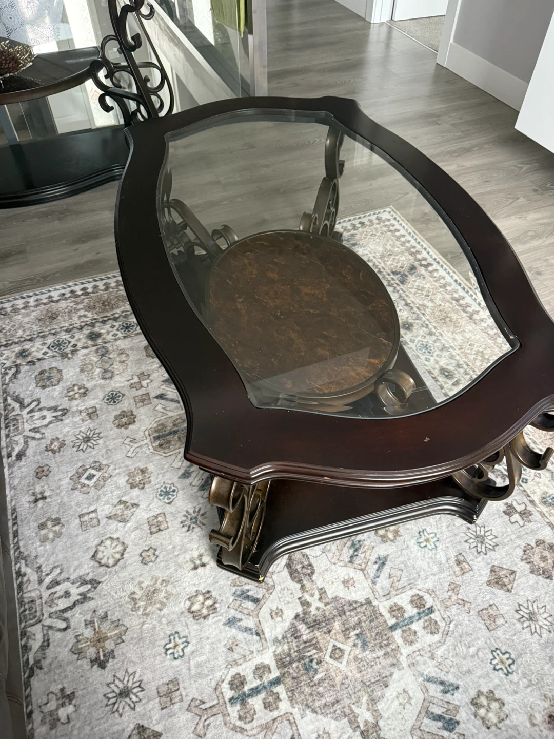 Selling a beautiful glass-top coffee table with a dark wood finish. It features a unique design with ornate metal accents. The table has a lower shelf for storage or display. It's in great condition and would be a lovely addition to any living room