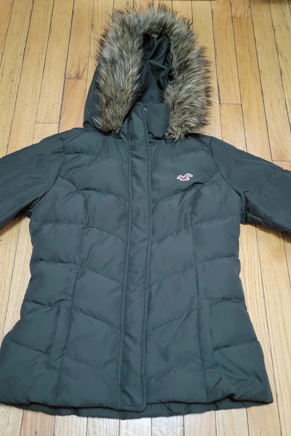 Selling a Hollister puffer jacket in great condition! It's a size medium and features a faux fur-trimmed hood. Perfect for staying warm and stylish during the colder months