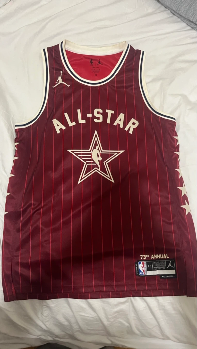 Selling a Jordan NBA All-Star jersey, featuring James #23 on the back! It's a size Large (48). The jersey is maroon with white accents and stars on the sides. It's the 73rd Annual All-Star edition. Made with Dri-FIT technology for comfort and performance!