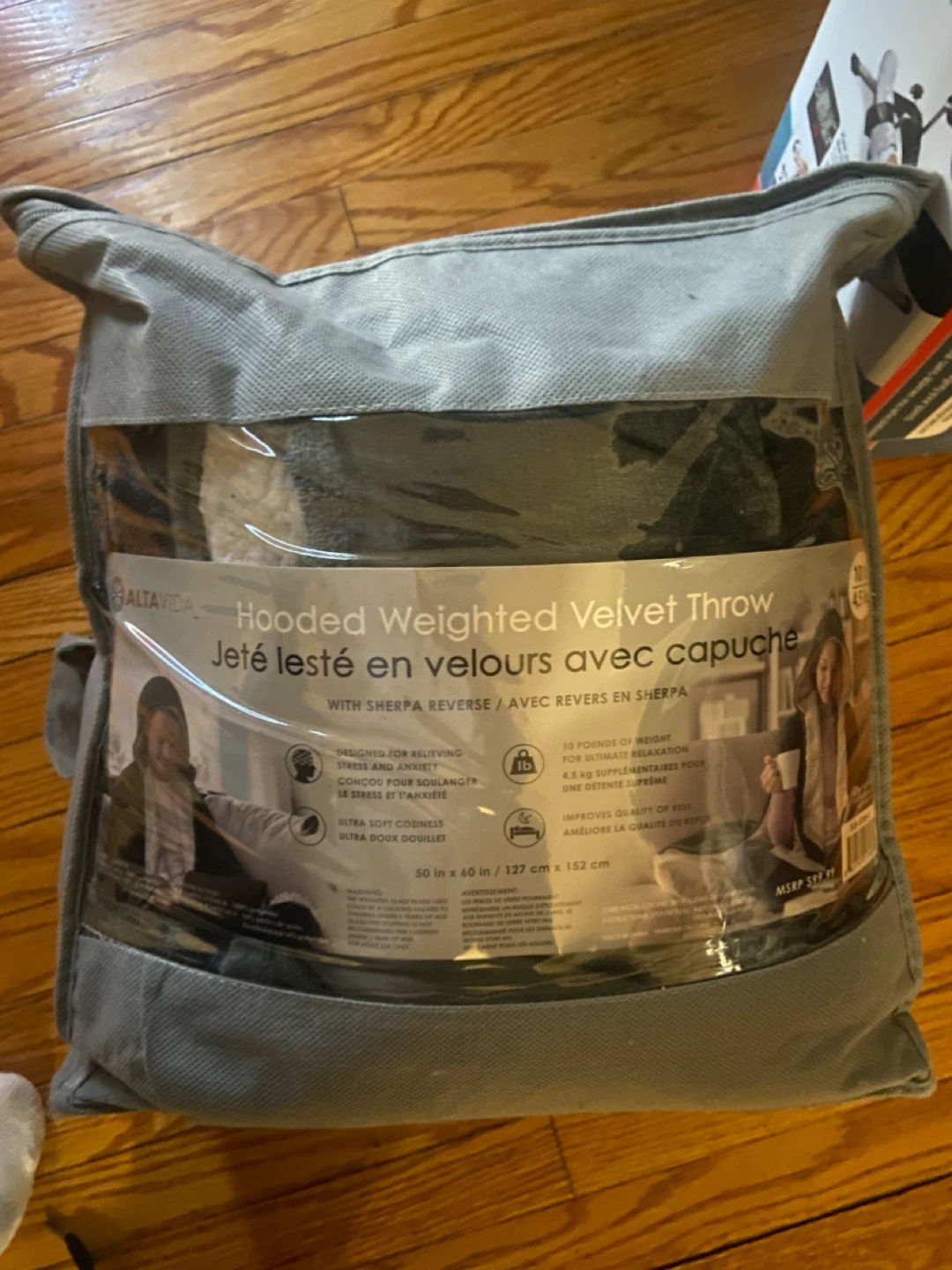 Selling an ALTAVIDA Hooded Weighted Velvet Throw. It's designed for relieving stress and anxiety, and the sherpa reverse adds extra comfort.