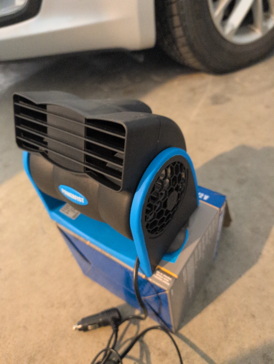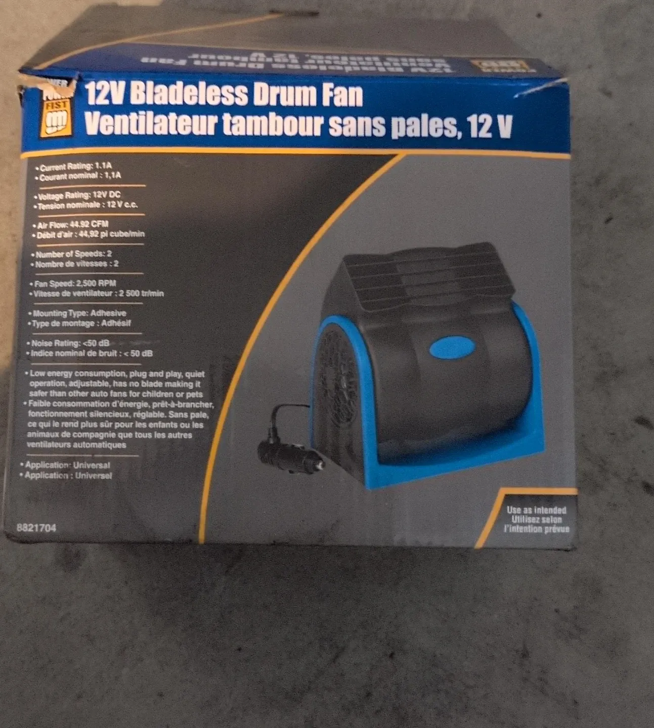 Selling a brand new Power Fist 12V Bladeless Drum Fan! It's still in its original packaging.