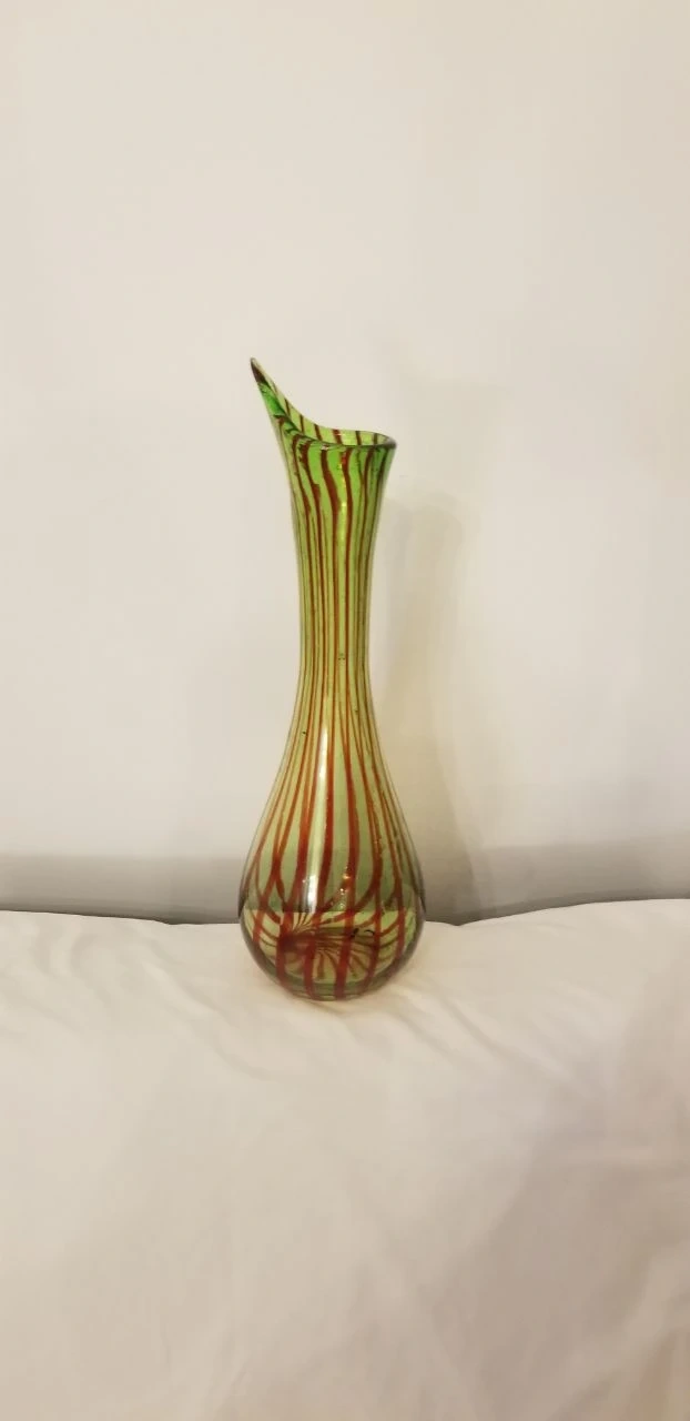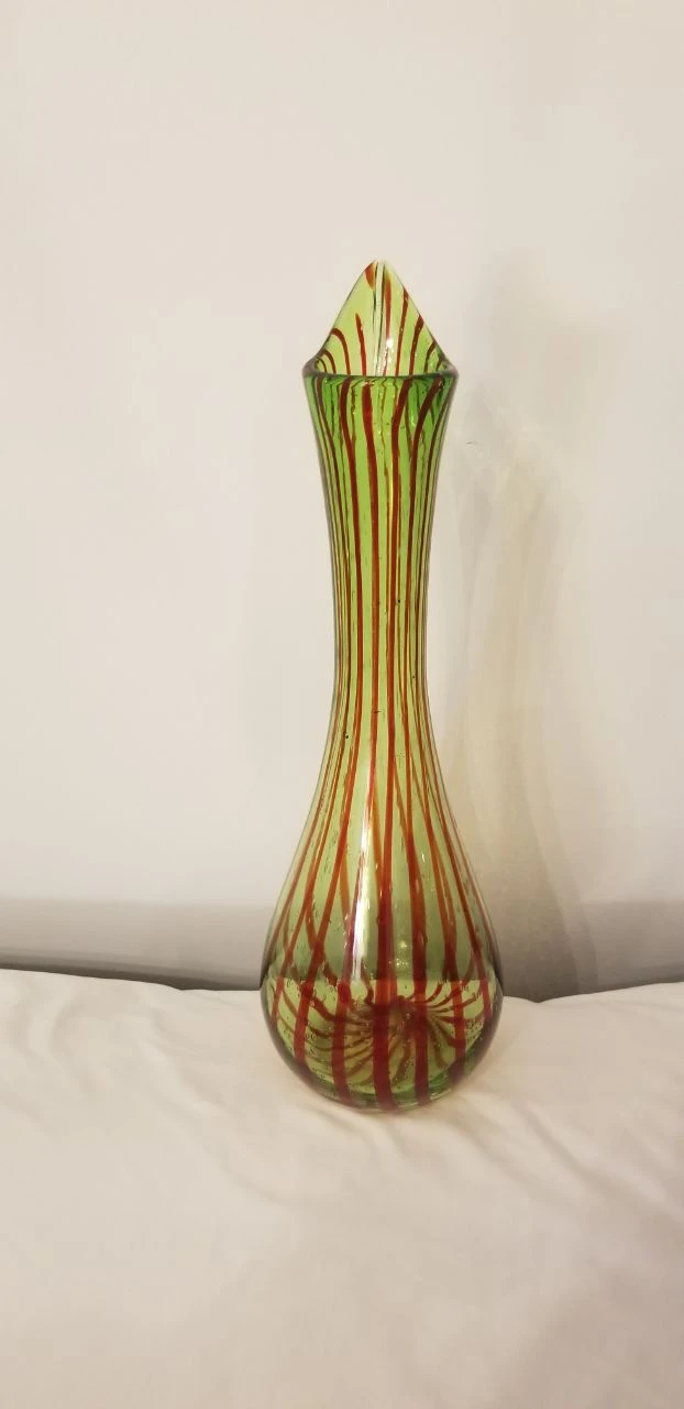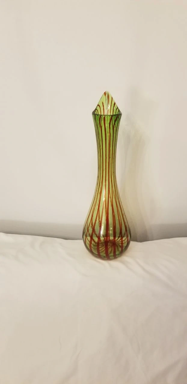 Selling a beautiful glass vase featuring a unique striped design in green and red. It would make a lovely addition to any home decor