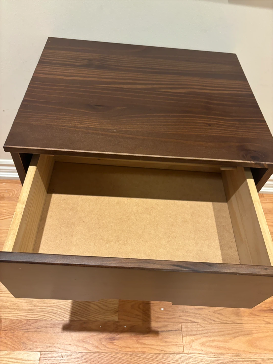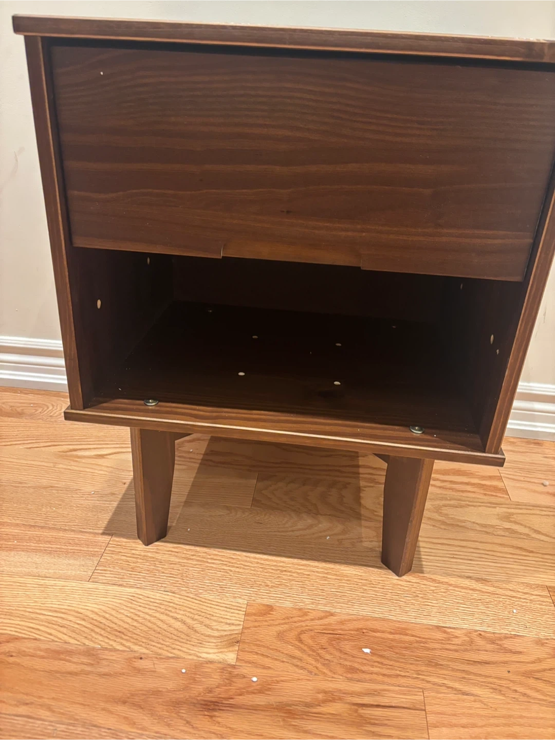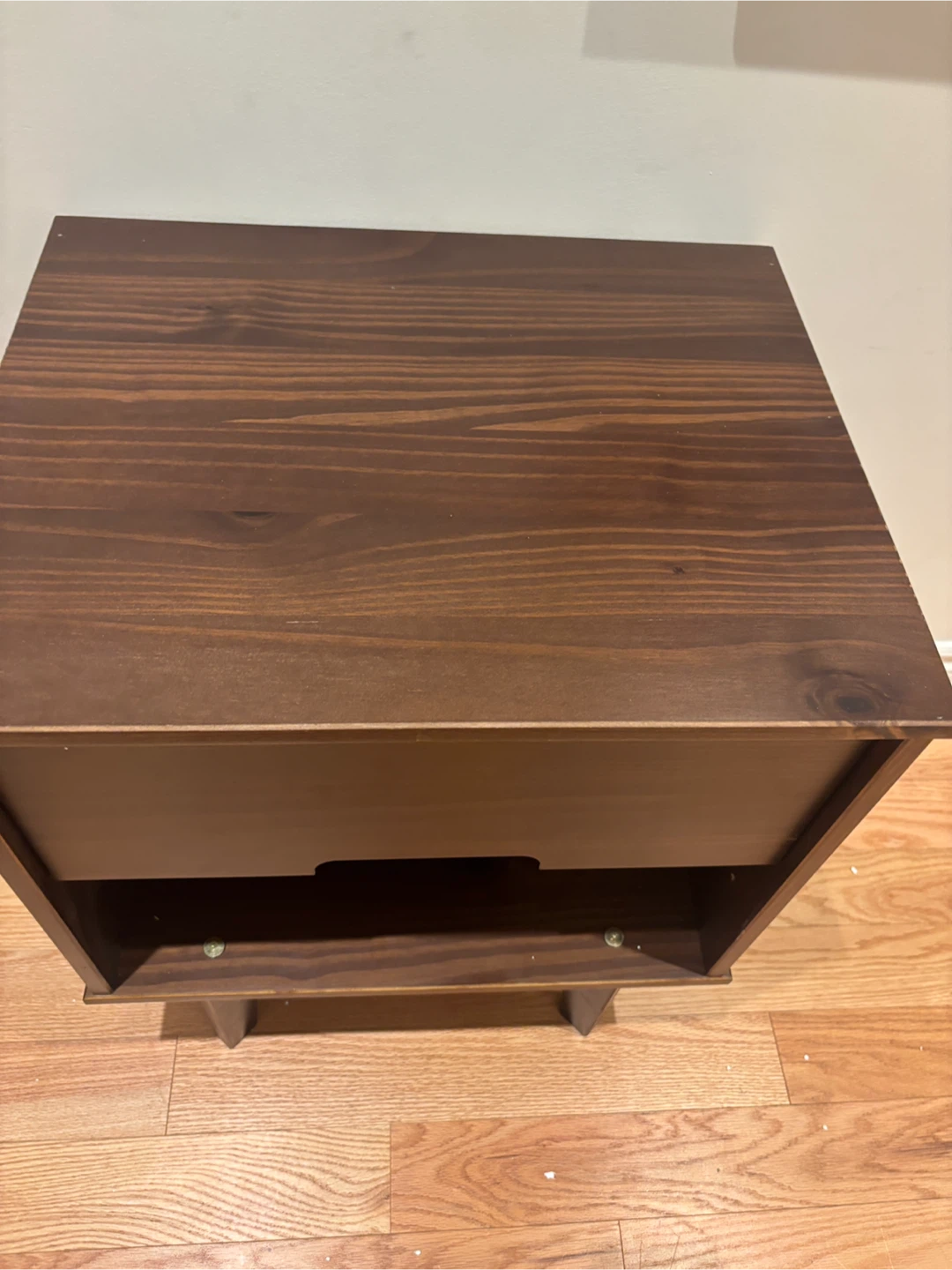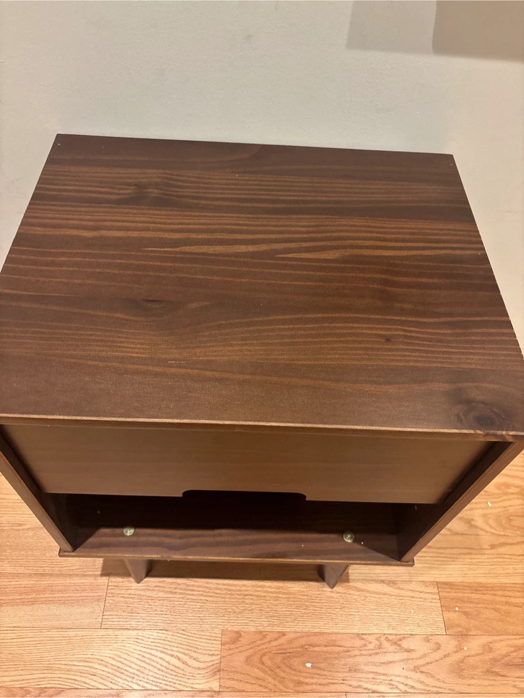 Here's a nice brown wood nightstand. It has a drawer and an open bottom shelf for storage. It would look great in any bedroom. Available for delivery and pickup