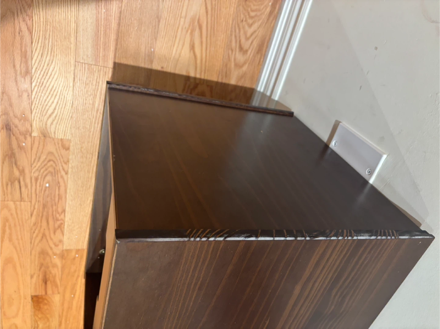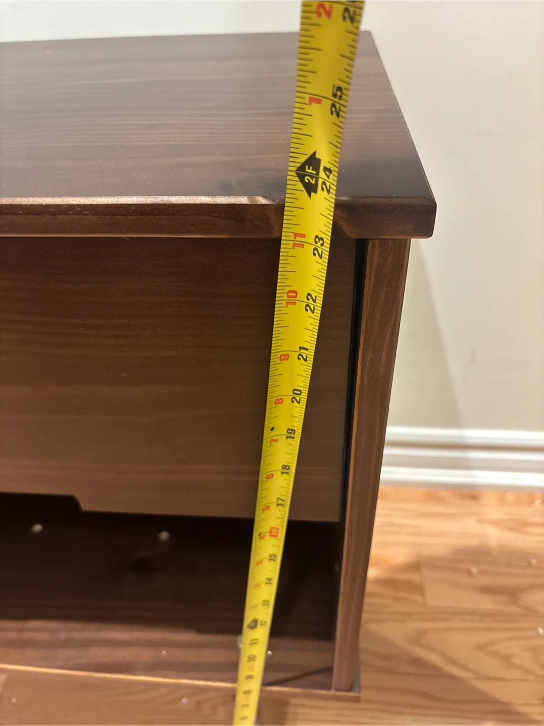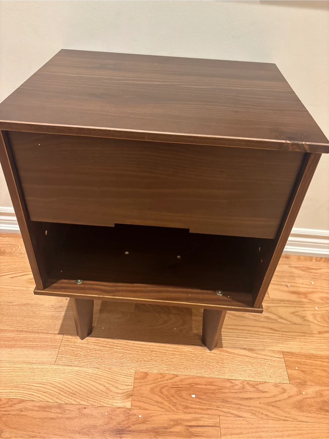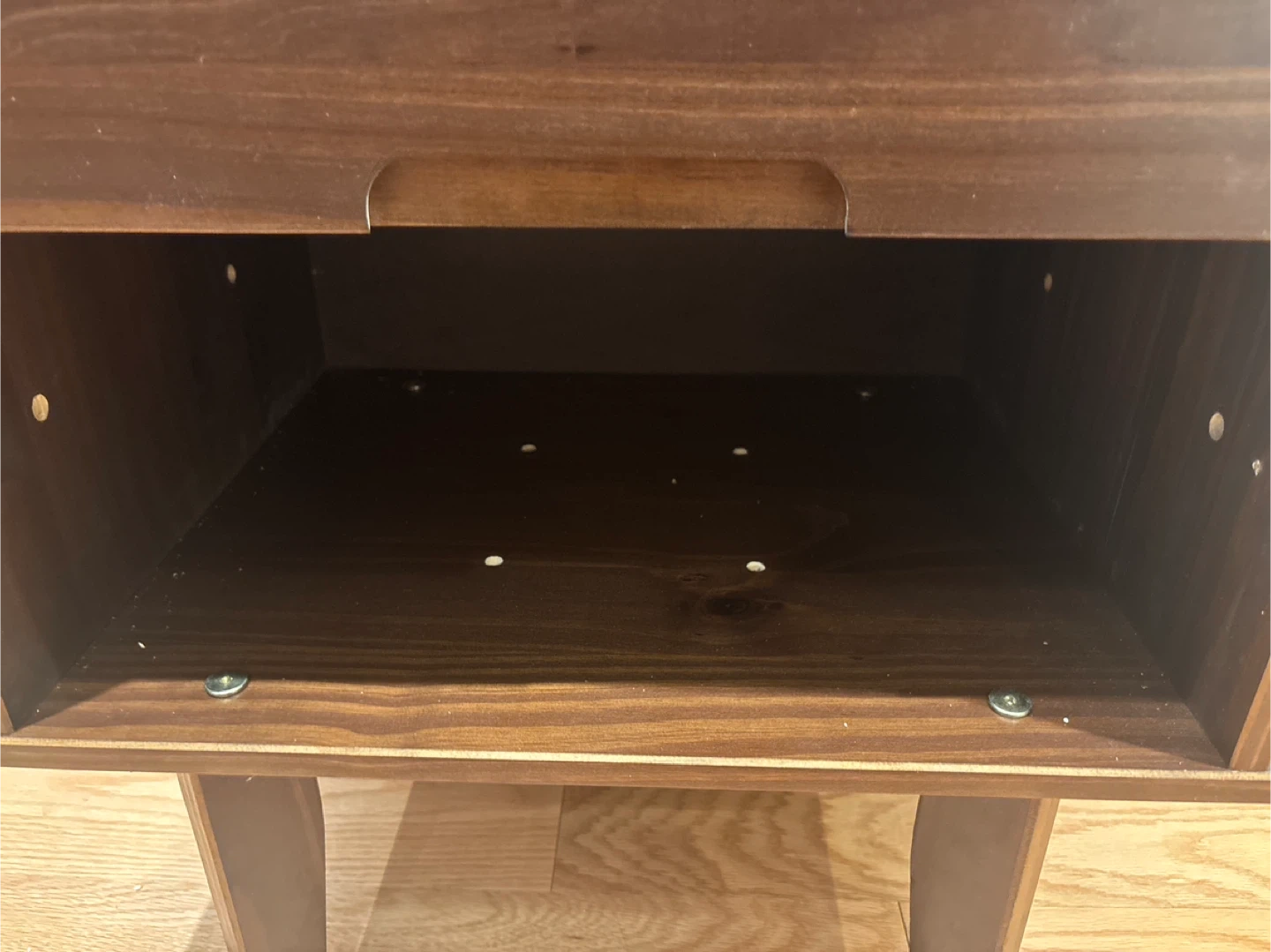 Here's a nice brown wood nightstand. It has a drawer and an open bottom shelf for storage. It would look great in any bedroom. Available for delivery and pickup