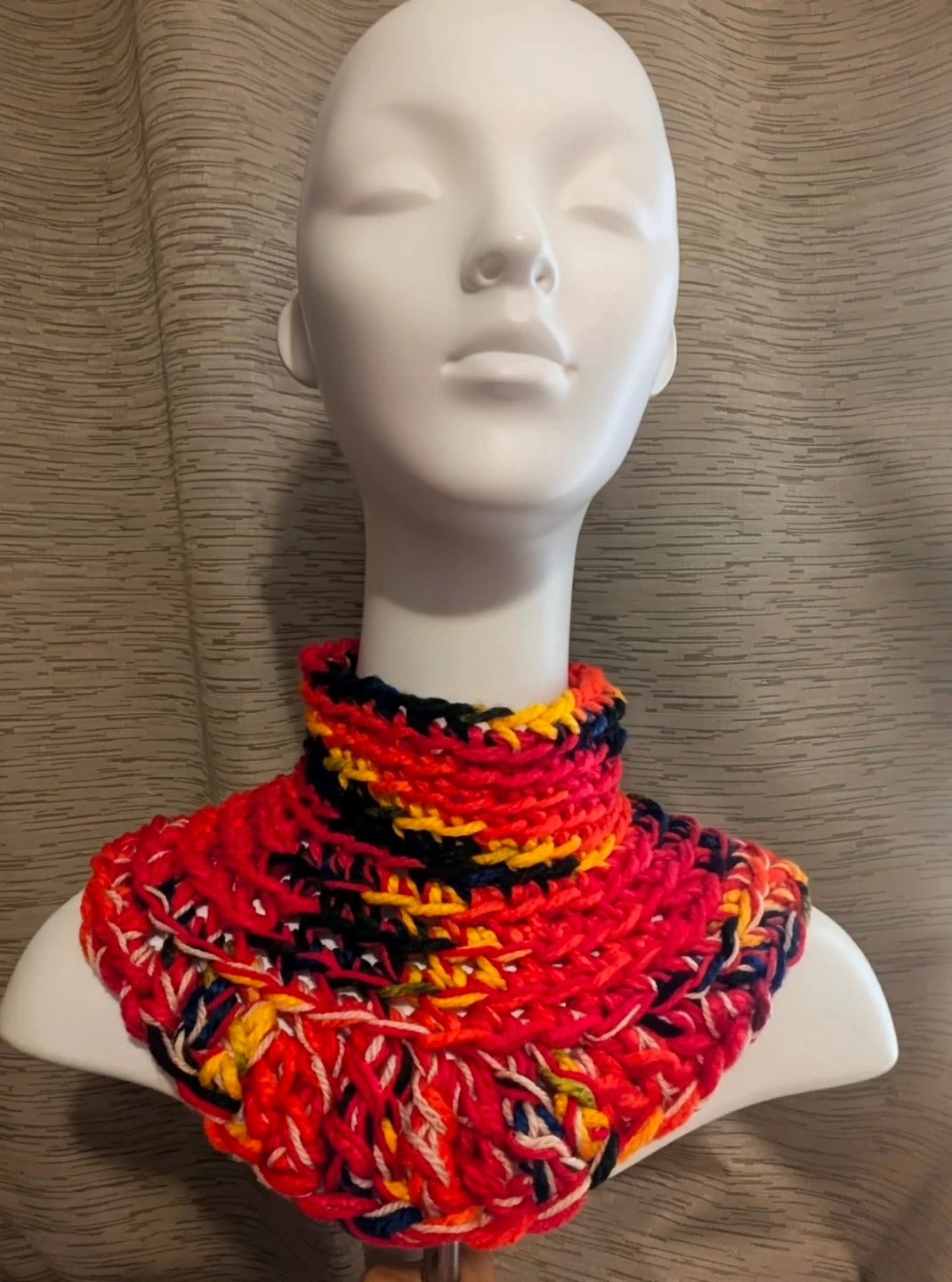 This is a newly made and unique, handmade crochet cowl! It features a vibrant mix of red, yellow, black, and white yarns. Perfect for adding a pop of colour and warmth to your outfit on chilly days.