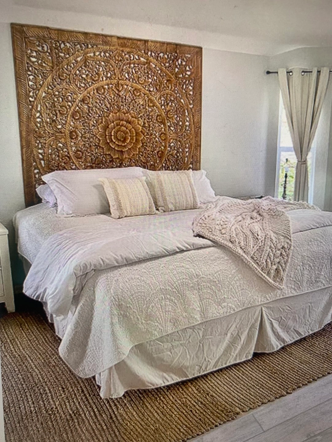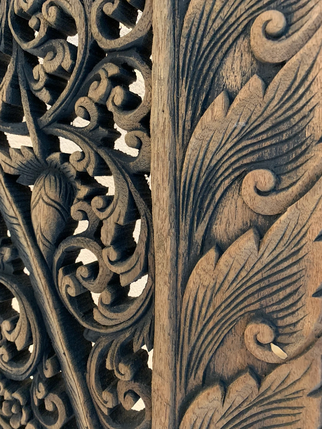 Six panels of Teak wood wall art carved by hand in Thailand. I personally chose and brought it by boat. It can be used as headboard, screen or to separate areas. It can be painted or left as is.