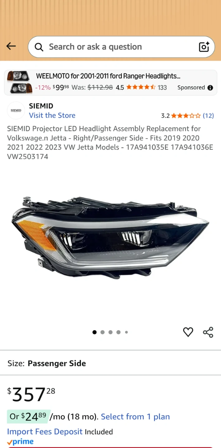 Selling a SIEMID projector LED headlight assembly for the passenger side of a Volkswagen Jetta. Fits models from 2019, 2020, 2021, 2022, and 2023. Part numbers are 17A941035E, 17A941036E, and VW2503174