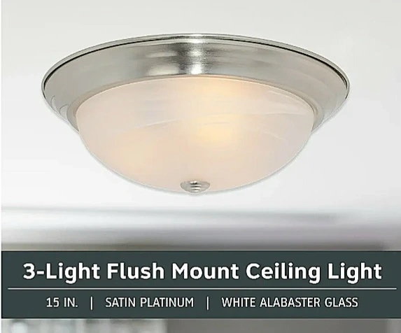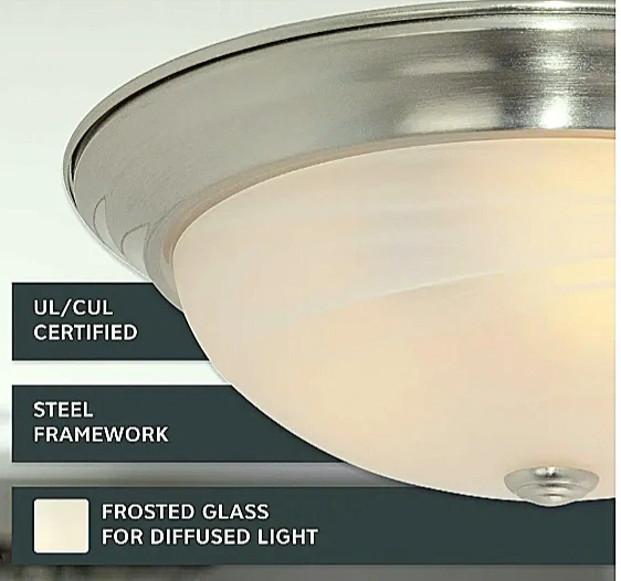 Illuminate your home with this brand new Home Maison Vernon flush mount ceiling light, featuring a brushed nickel finish and alabaster glass shade. Designed for use with two 60-watt (max) medium base bulbs, it measures 5.3 inches (13.3 cm) wide and 5.7/16 inches (13.8 cm) high.