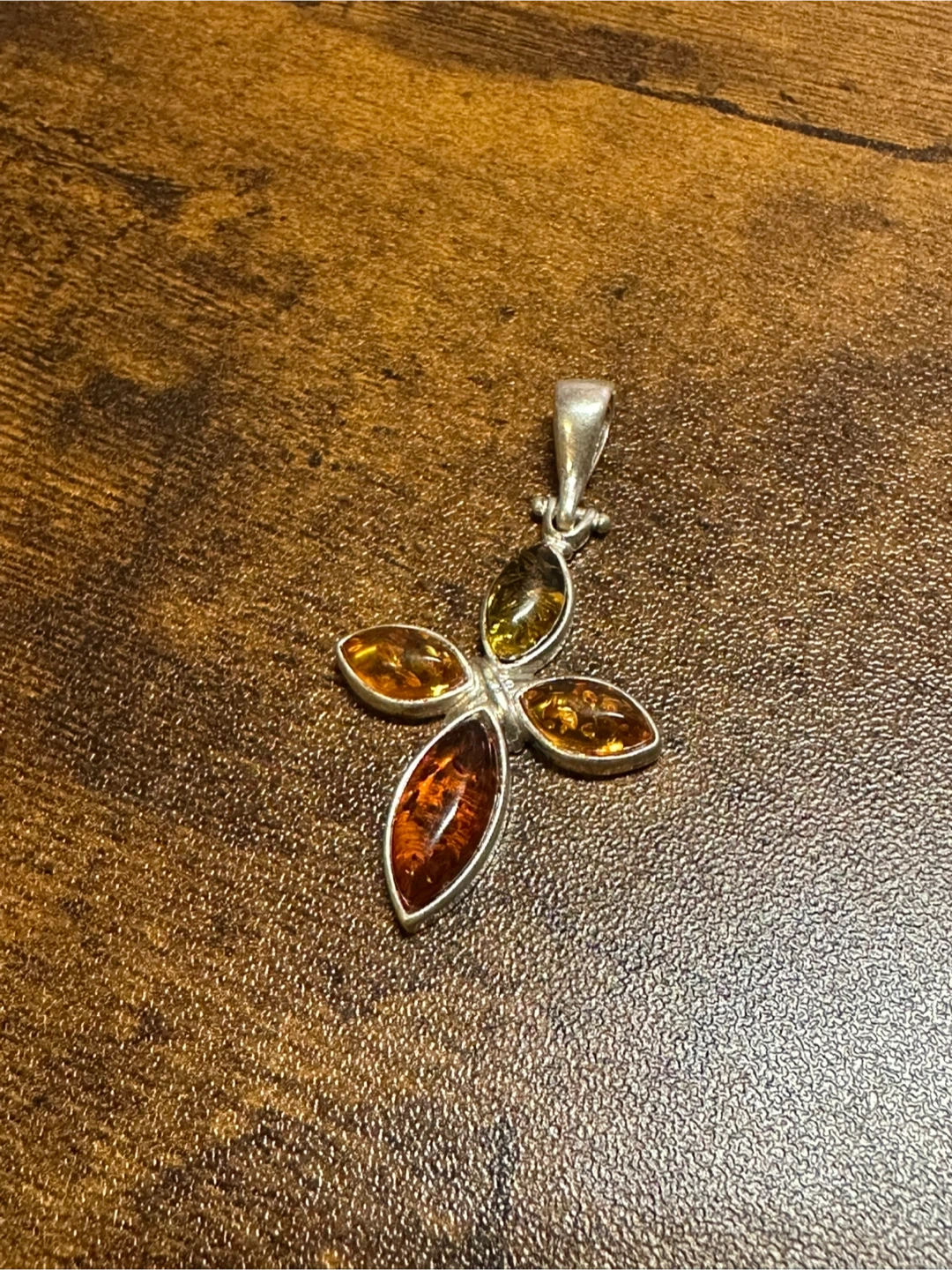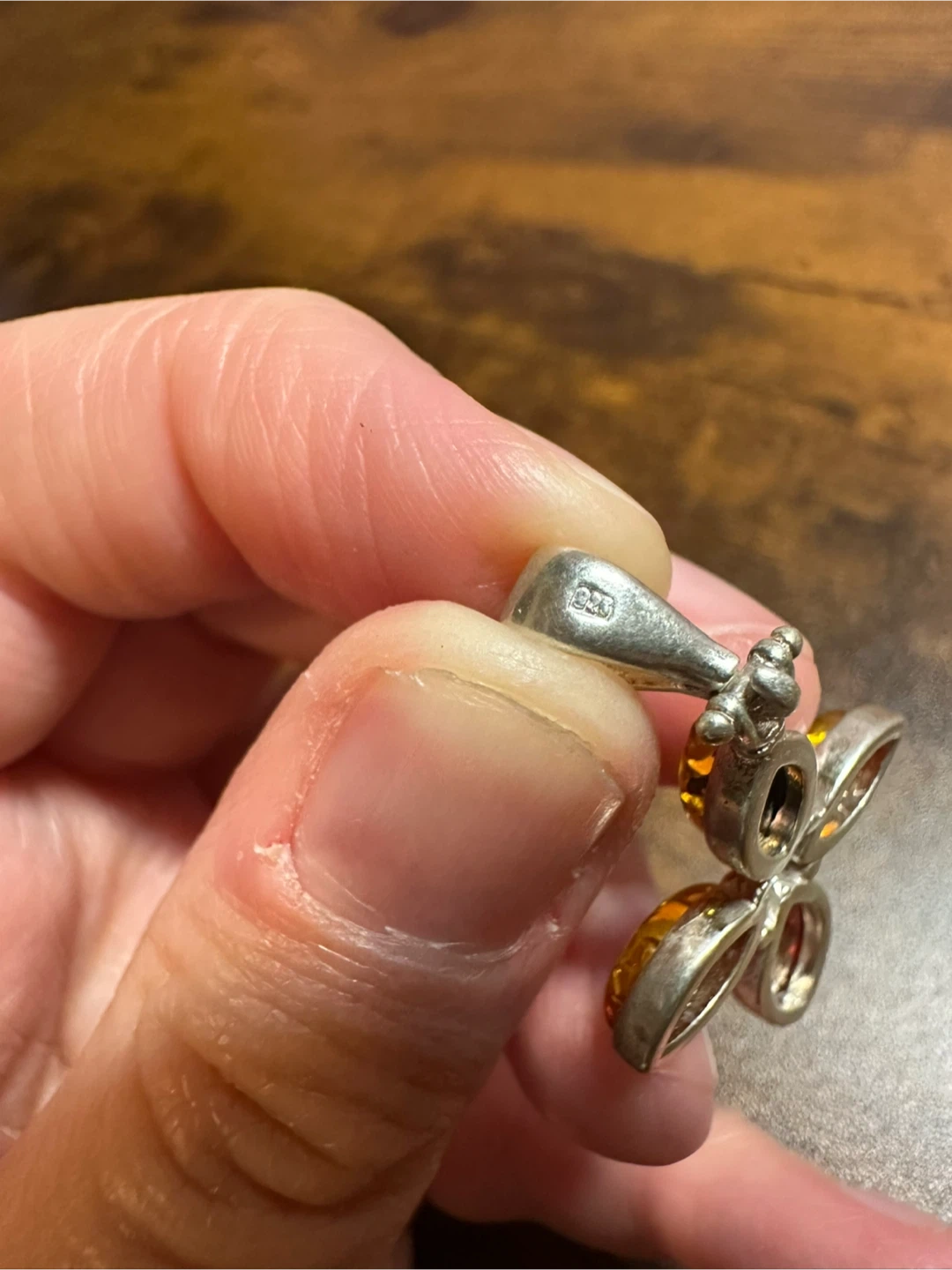 Etched with 925 to indicate sterling silver. I’m unsure of what the stones are, but I believe they’re amber.