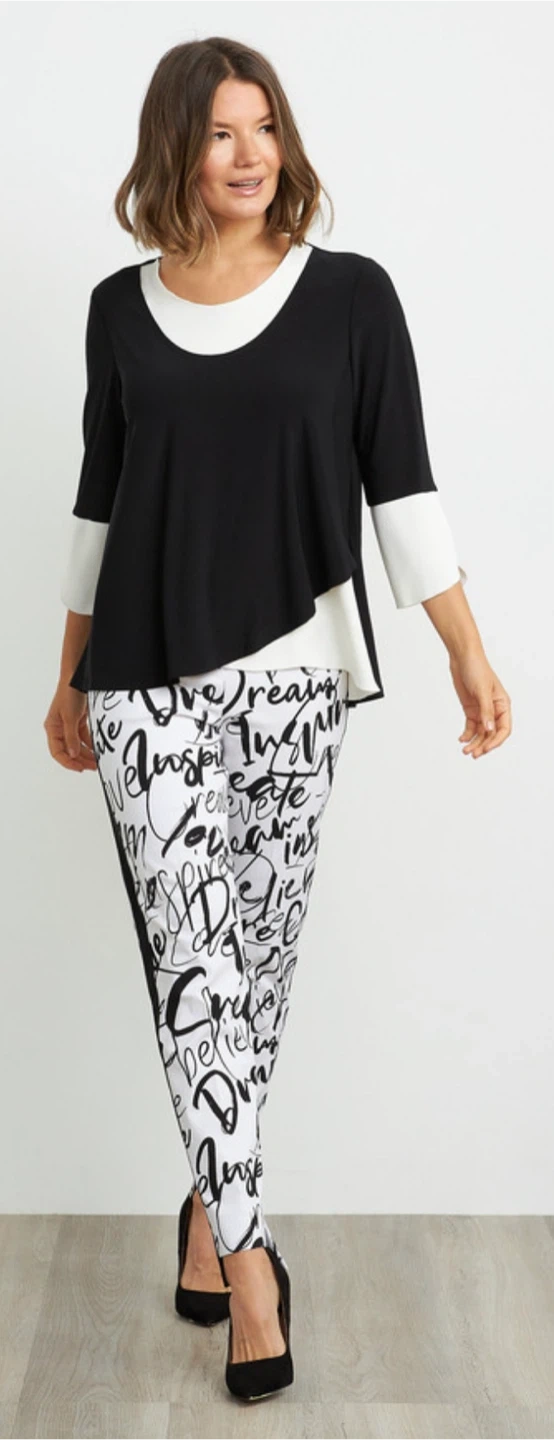 Bold beauties, these pants are for you. This pair of Joseph Ribkoff graffiti print wide leg pants a striking alternative to a basic black trouser or capri. The simplicity of black and white meets the intensely fun all-over graffiti pattern, providing you with an inspired way to infuse a little vibrancy into your wardrobe. For a truly stunning look, pair with a solid colour top and let these pants do all the talking!