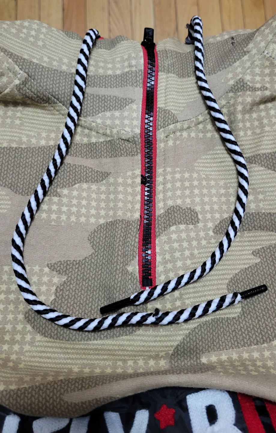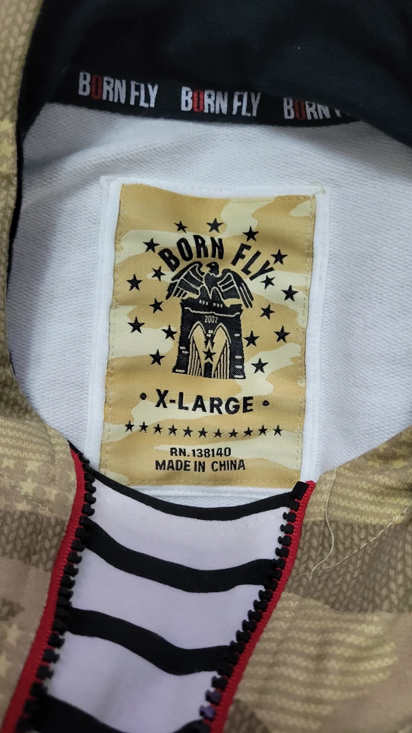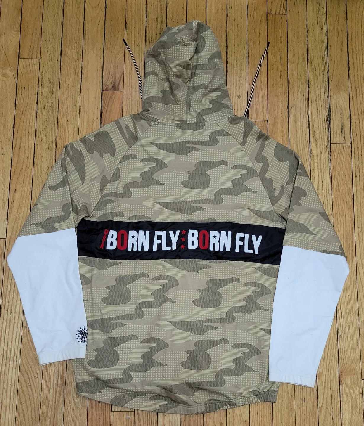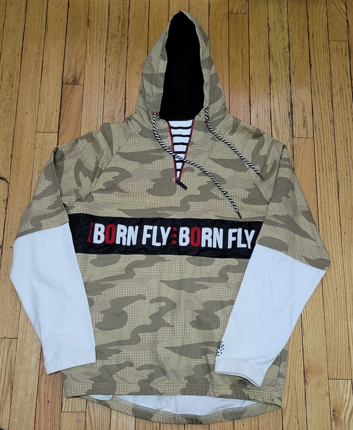 Selling a Born Fly camo hoodie in size X-Large. It's a stylish piece with a unique camo pattern and white sleeves. The hoodie features a black and white striped lining and a red zipper detail. Perfect for adding a cool, urban touch to your wardrobe!