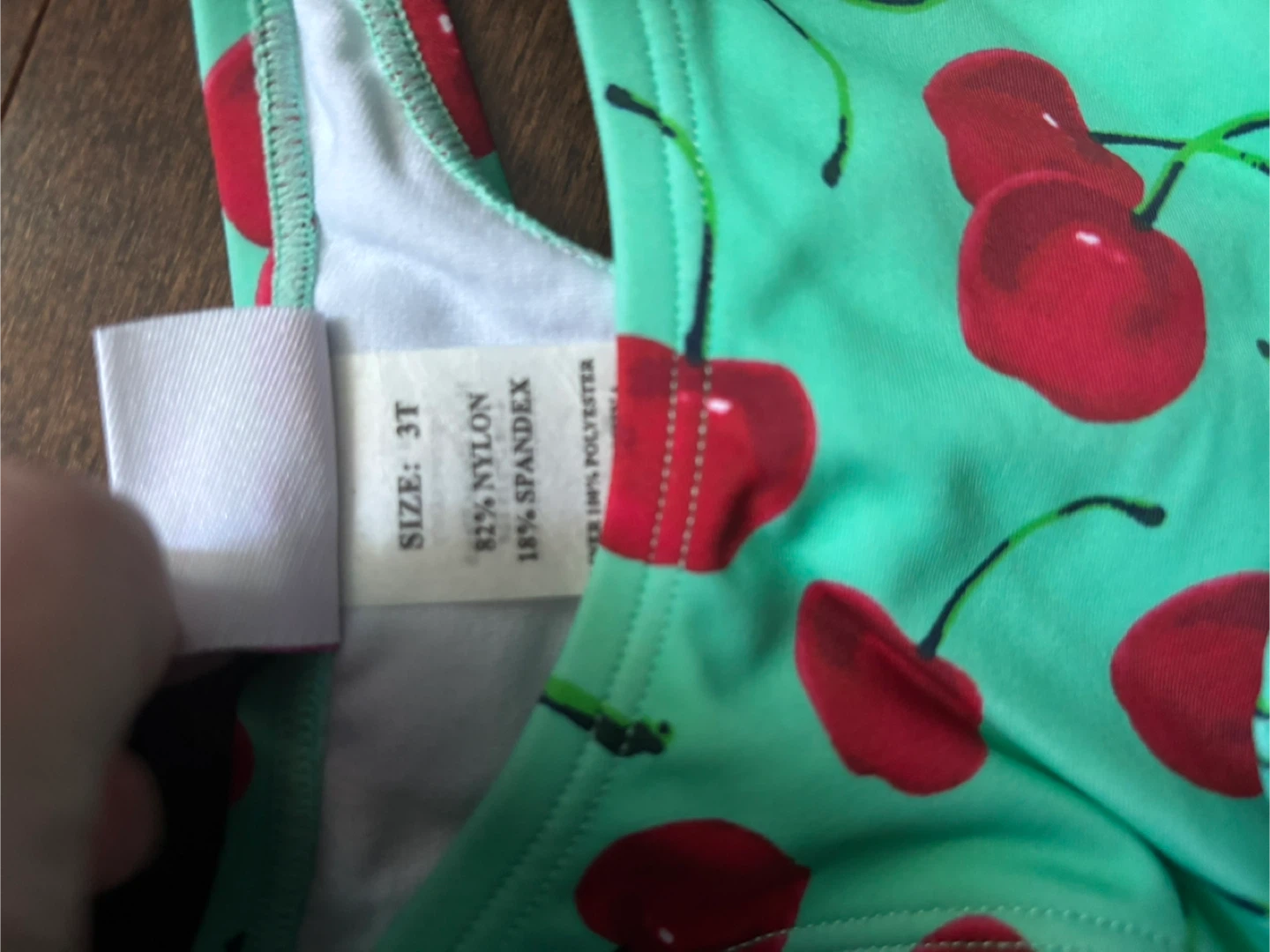 This cute Lime Ricki swimsuit is perfect for your little one! It's a size 3T and features a fun cherry print. The material is 82% nylon and 18% spandex, making it comfy and stretchy for swimming and playing