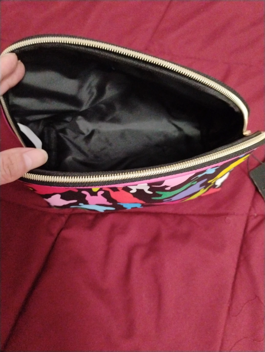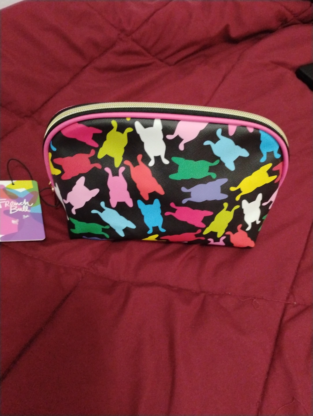 Selling a makeup bag! It features a colorful dog pattern on a black background. It's perfect for storing your makeup or other small items