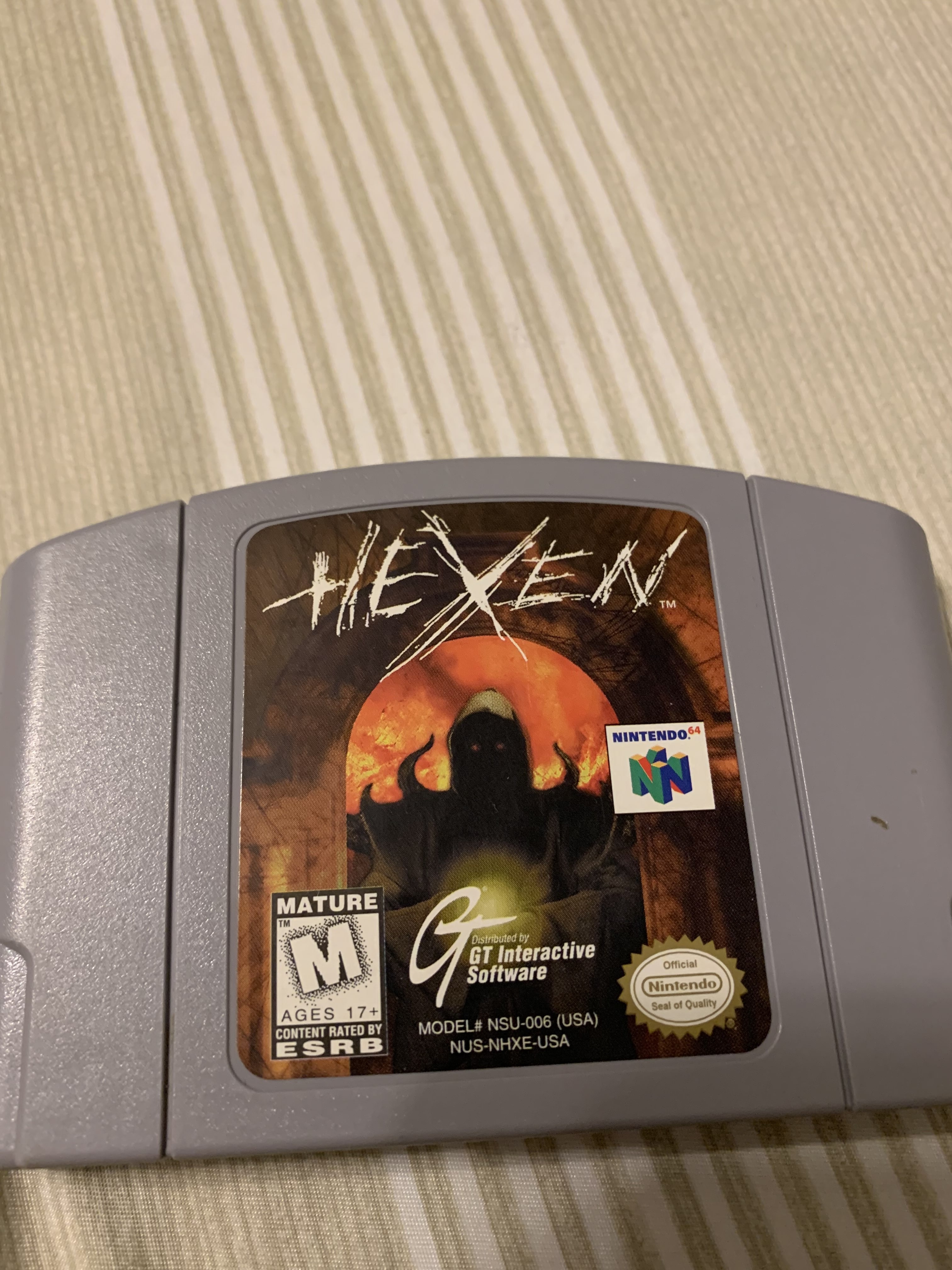 Selling a used Hexen game for the Nintendo 64. Rated M for Mature. Distributed by GT Interactive Software. Model number NSU-006 (USA).