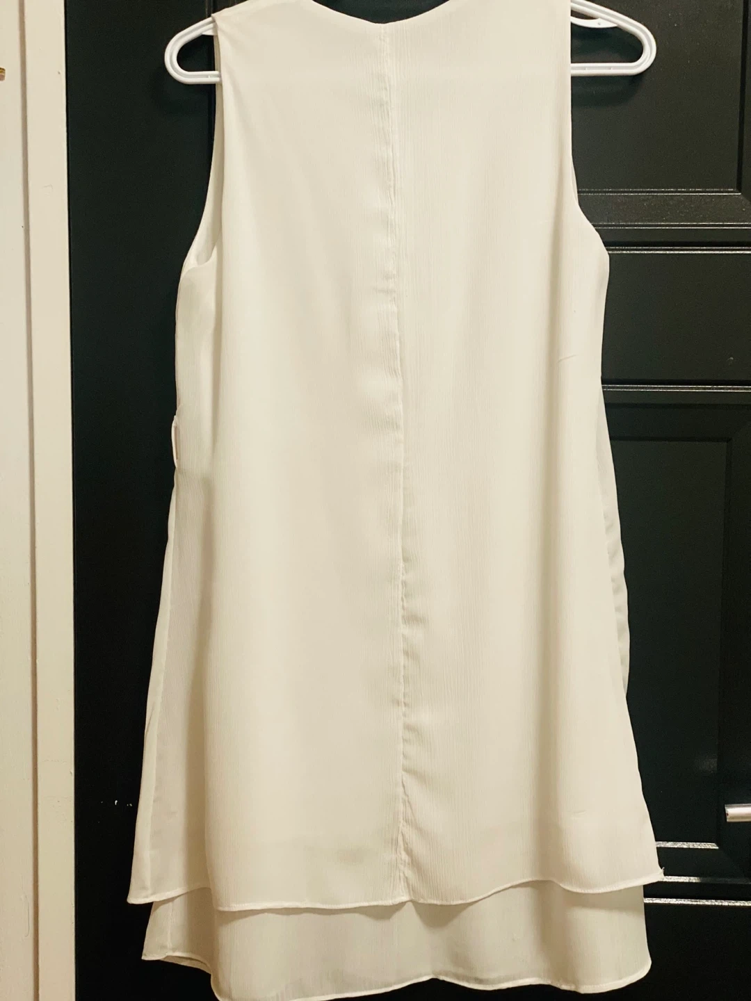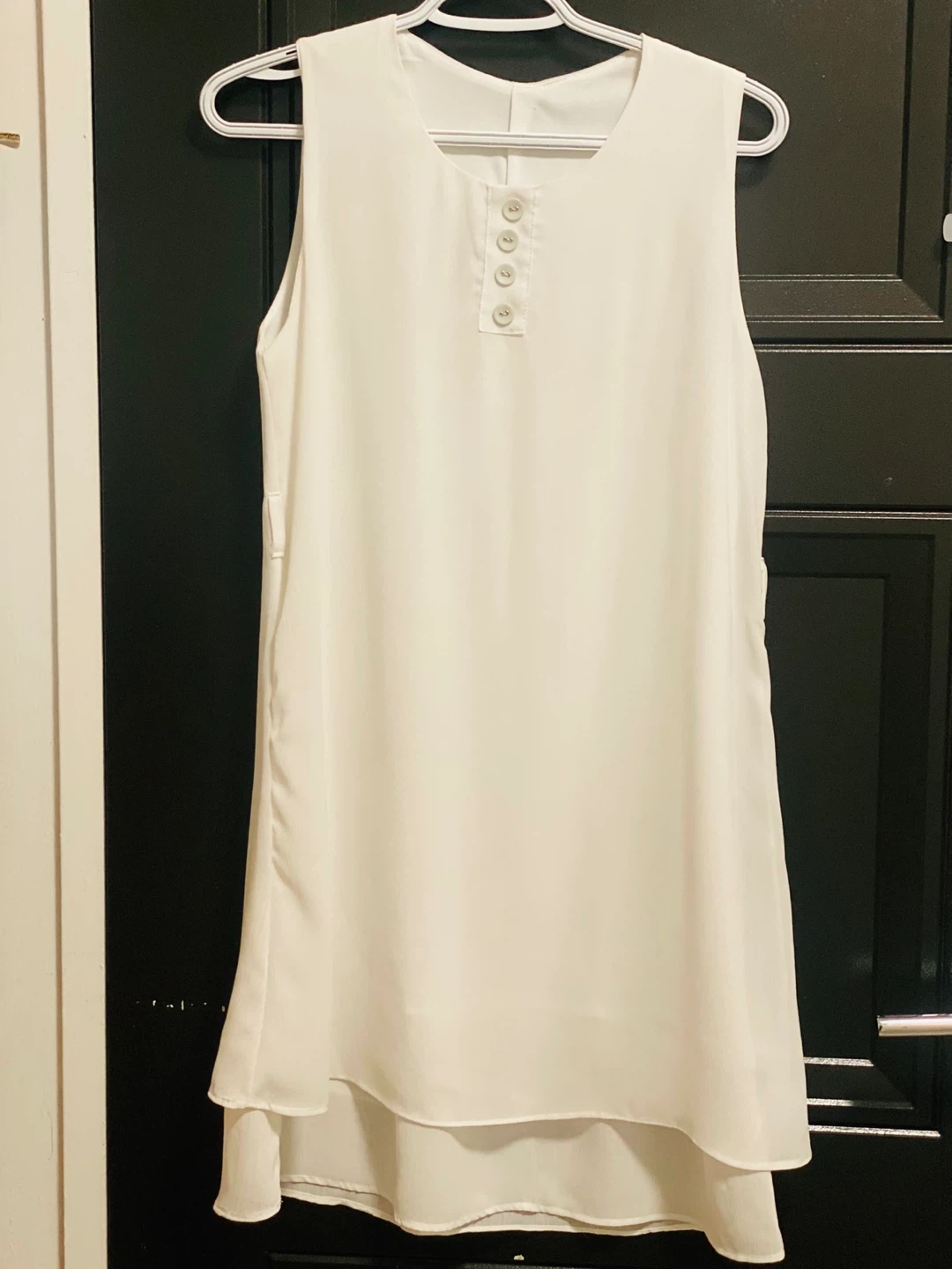 Selling a lovely white sleeveless dress. It features a layered hem and button detailing near the neckline. The material is lightweight and flowy. It is in great condition, perfect for a variety of occasions.