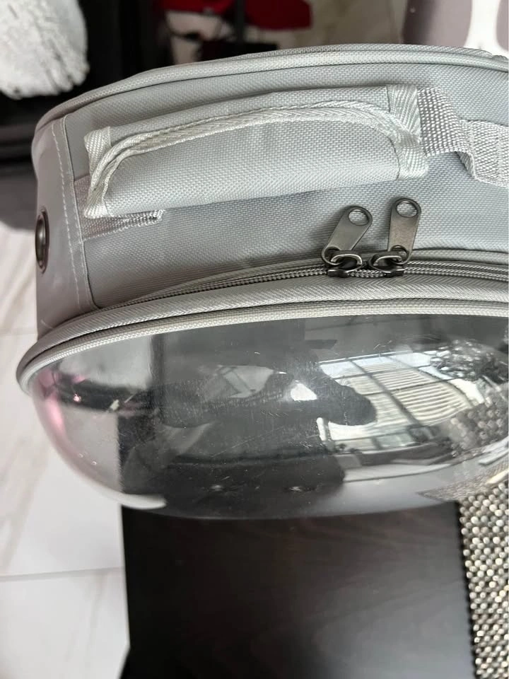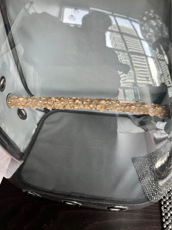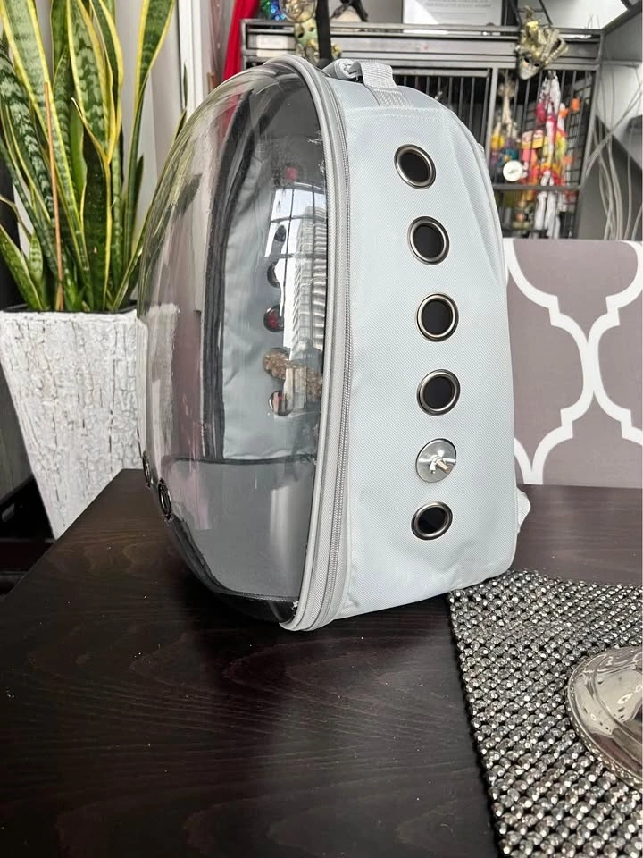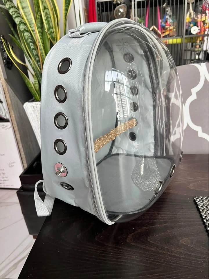 New animal Backpack or travel nap sack carrier cage is great for med size (or smaller) bird/parrot. Comes with removable perch so can be used for cats, ferrets, or small dogs too. Clear plastic dome like window with lots of ventilation for the pet to experience it’s surroundings. Lighter Grey colour fabric with zippers.