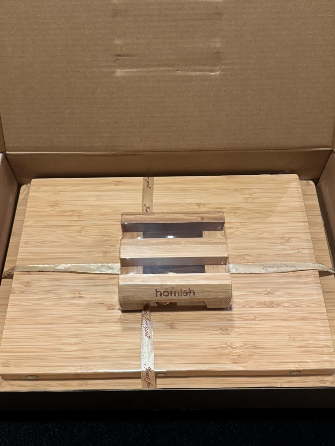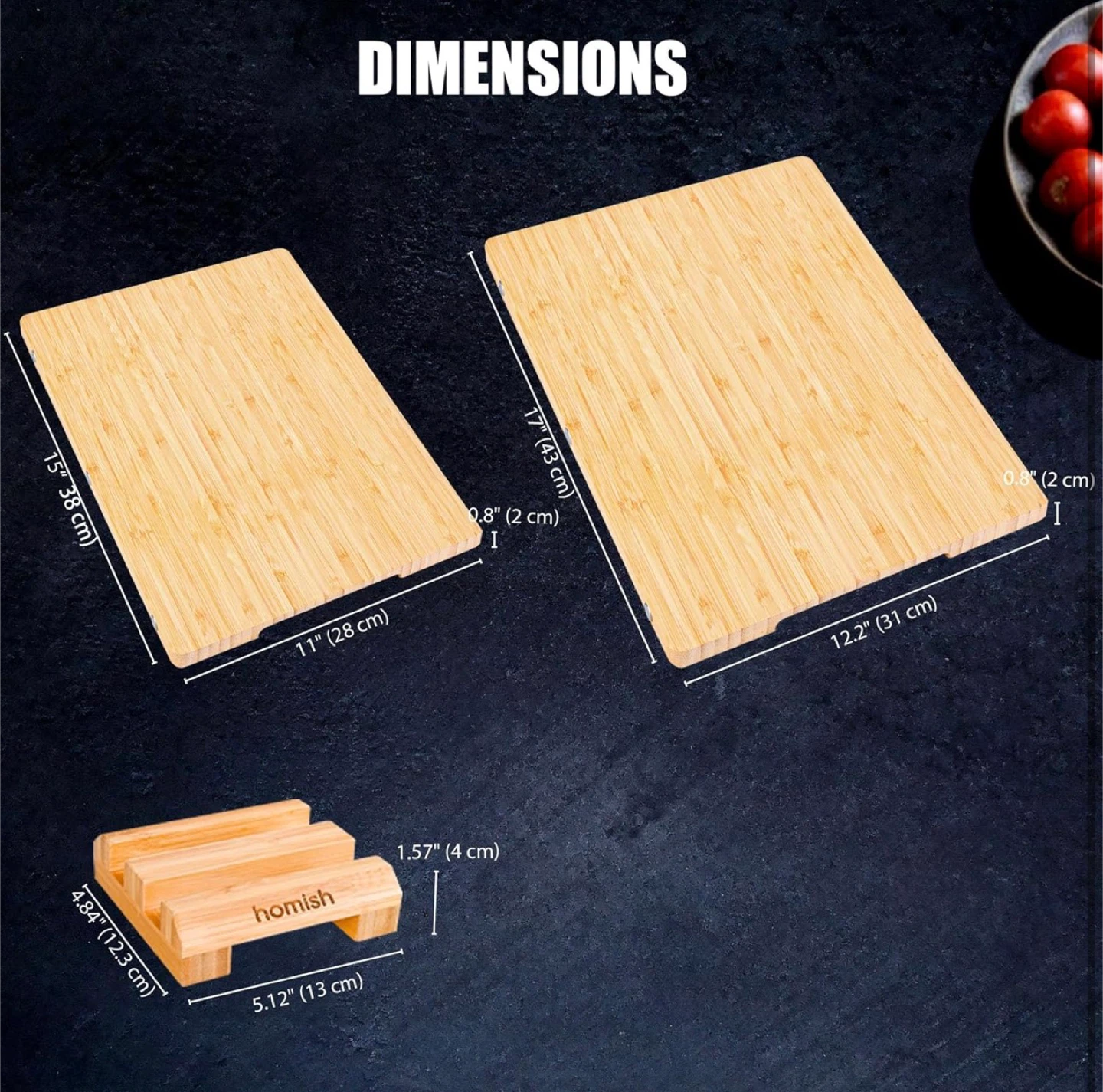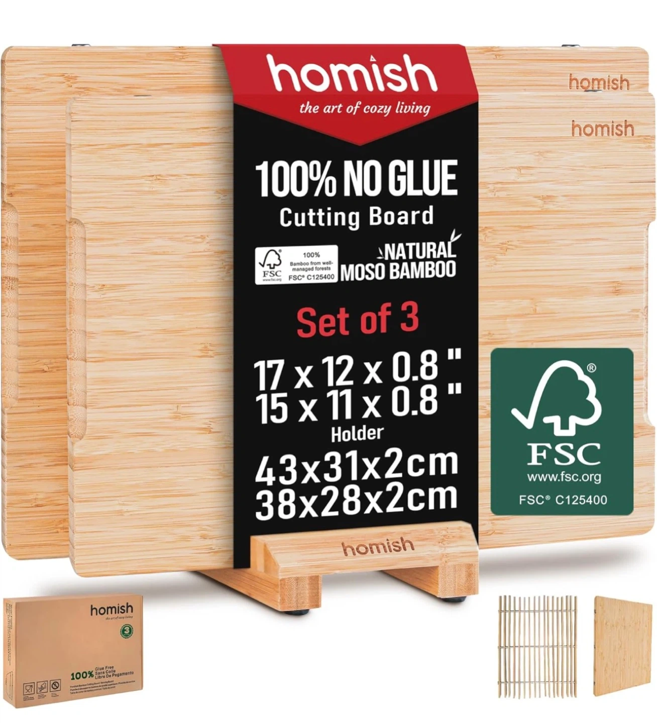 • Product Features: Includes two boards (Medium 15” x 11” and Large 17” x 12”) with a storage holder, made from FSC-certified sustainable bamboo.