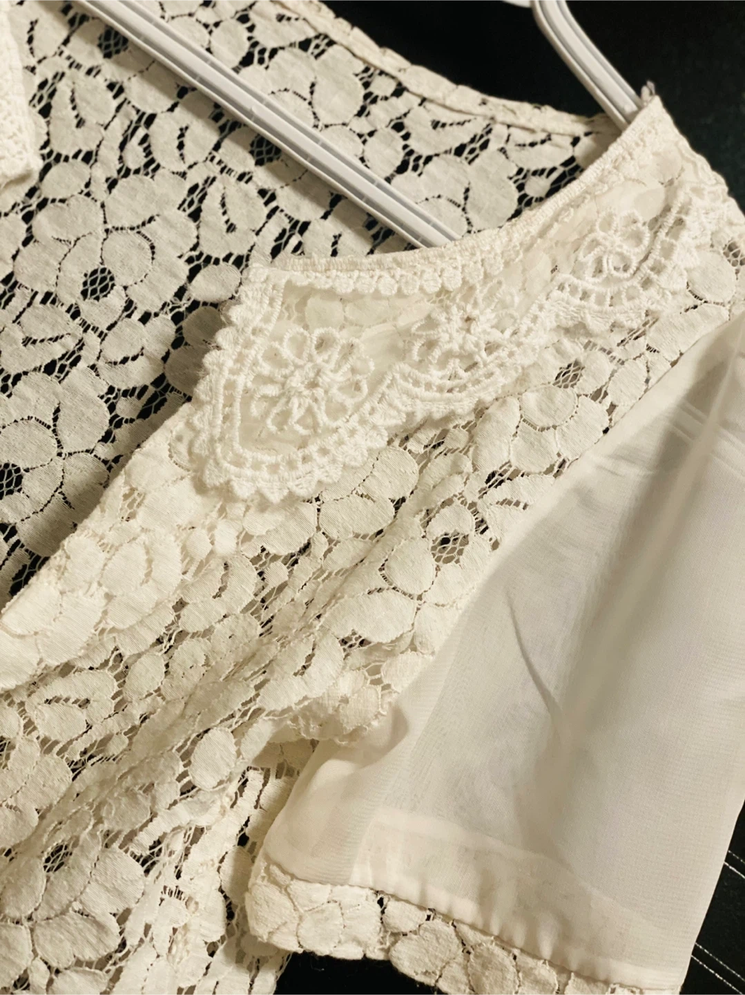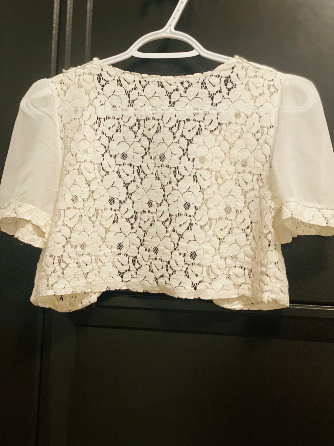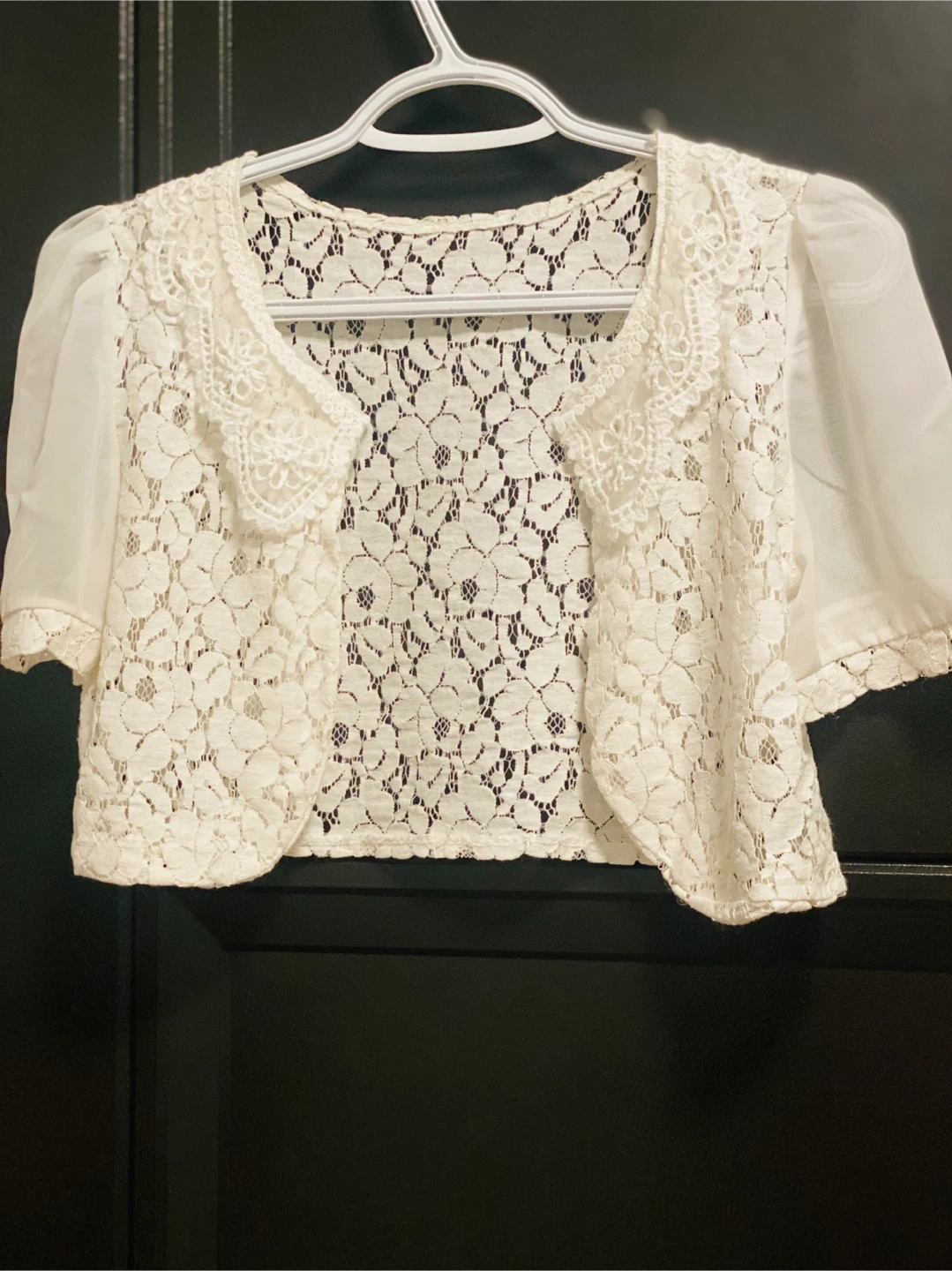 This cute lace bolero, with chiffon sleeves, is perfect to dress up any outfit. It is in good condition. The delicate lace pattern and sheer sleeves add a touch of elegance. It is a size Medium.