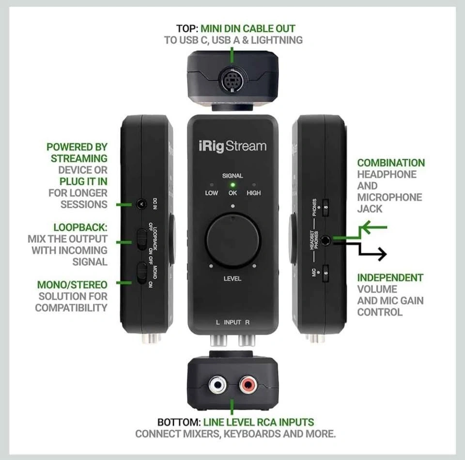 IK Multimedia iRig Stream stereo audio interface for iPhone, iPad, Mac, iOS and PC with USB-C, Lightning and USB for 24-bit, 48 kHz recording from mixers and studio gear