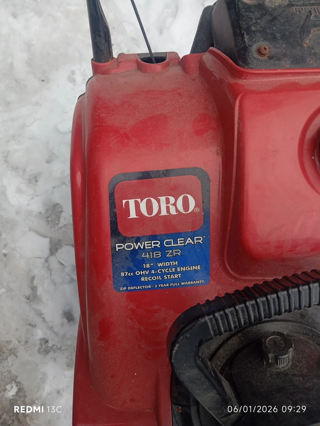 Selling a Toro Power Clear 418 ZR snowblower. It has an 18" width and an 87cc OHV 4-cycle engine with recoil start. Great for clearing snow this winter!